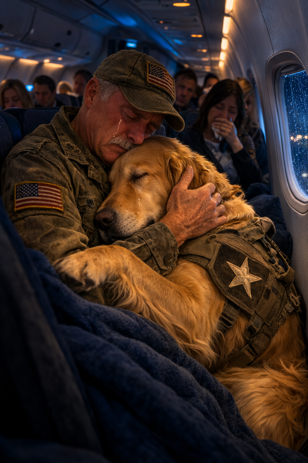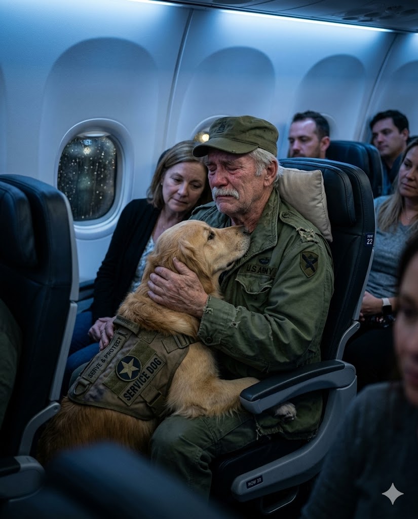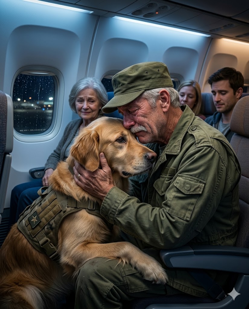 The animal moved slowly beside him, its dark eyes scanning the cabin with the calm focus of something trained for danger. A small black vest rested across its back.