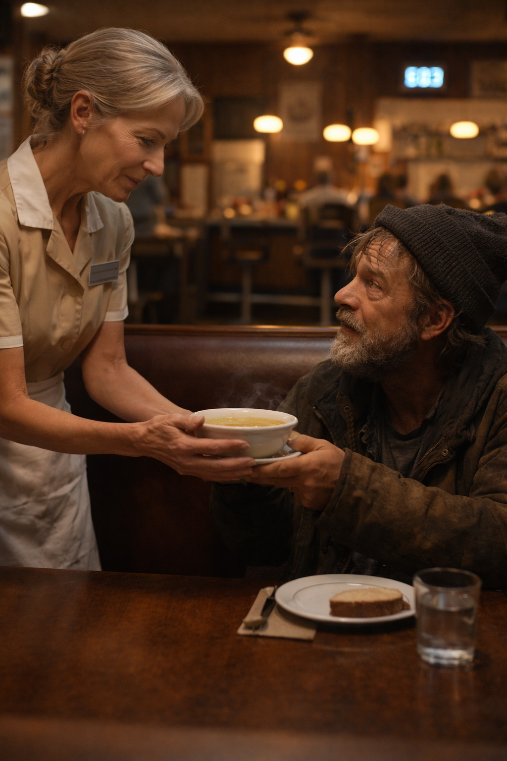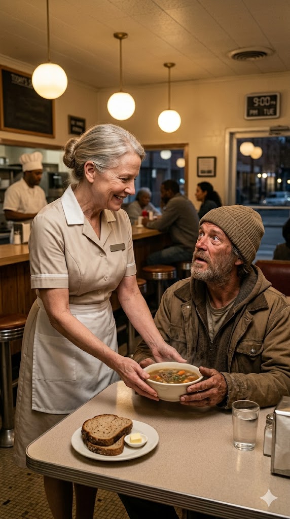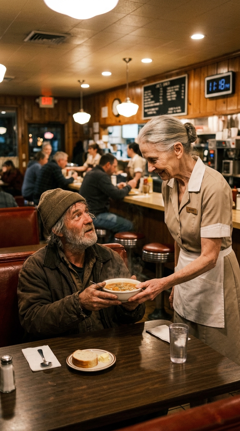 She moved quickly, ladling a bowl of hot chicken soup and grabbing a fresh slice of buttered bread. She set the meal in front of him. His hands trembled slightly as he lifted the spoon. For a brief moment, he simply stared at the food—then he began to eat.
