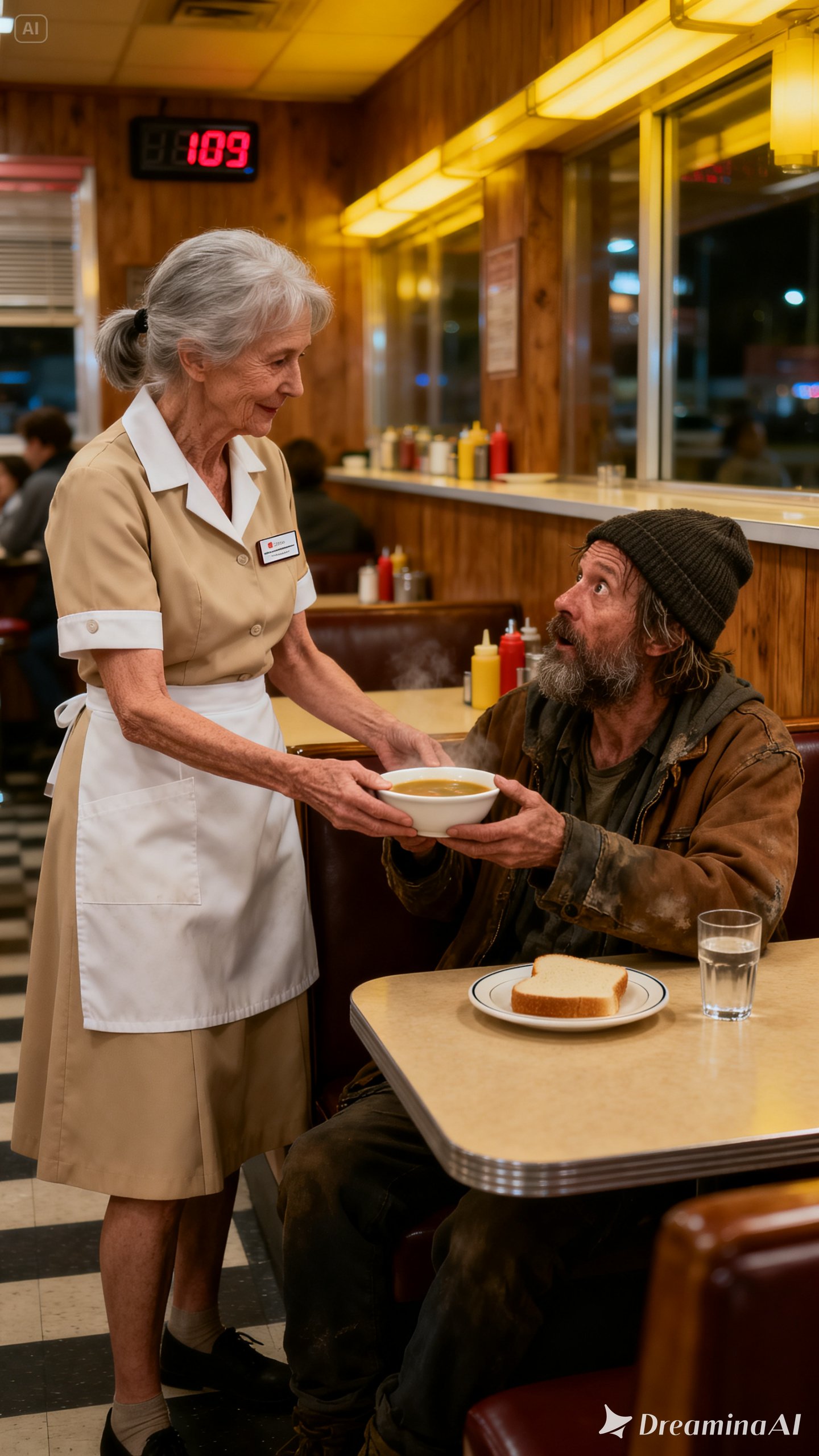 Without a second thought, she guided him to a booth in the corner. “You sit tight, dear. I’ll get you something warm.”