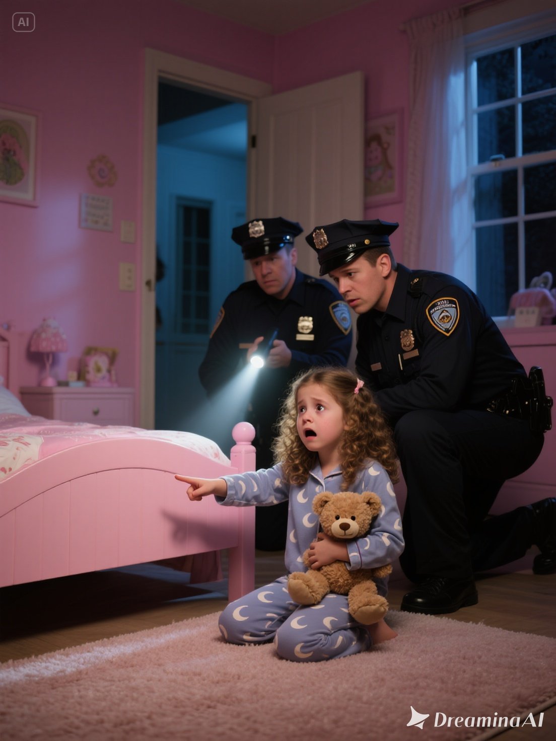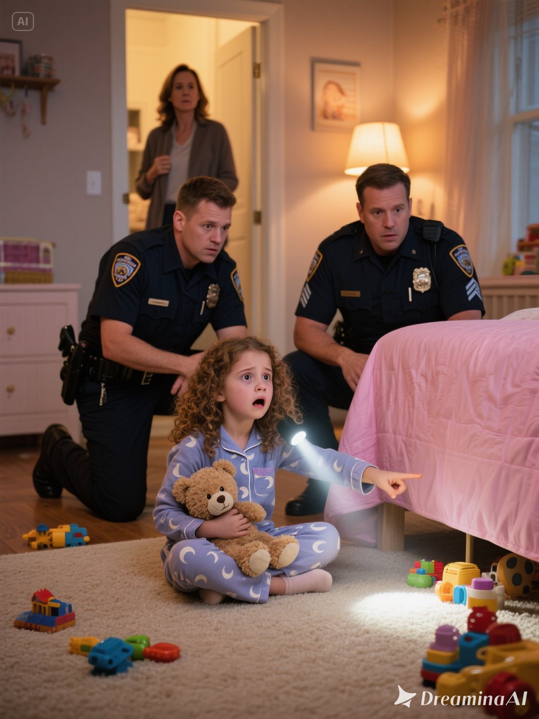 Mia sat cross-legged on her bedroom rug, wearing pajamas covered in tiny moons, clutching her stuffed bear like a shield. She didn’t run to the officers. She only pointed—to the small bed with the pink quilt folded neatly at the corner.