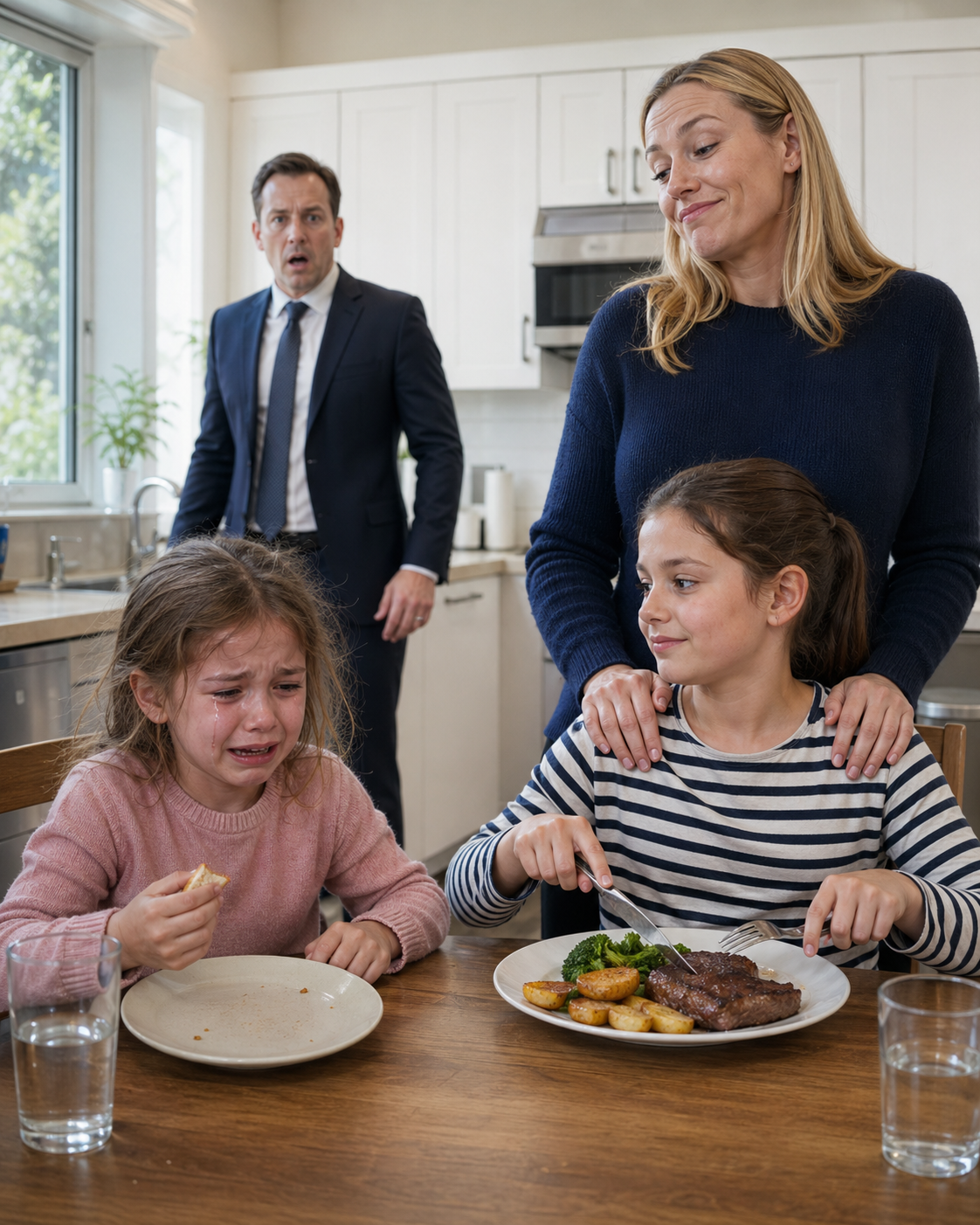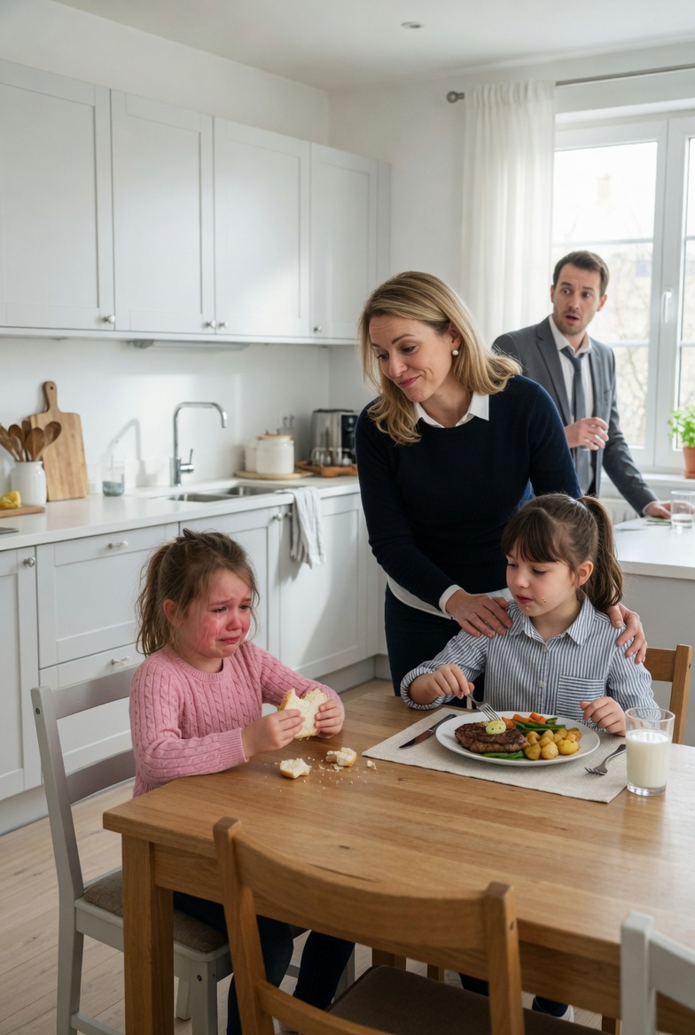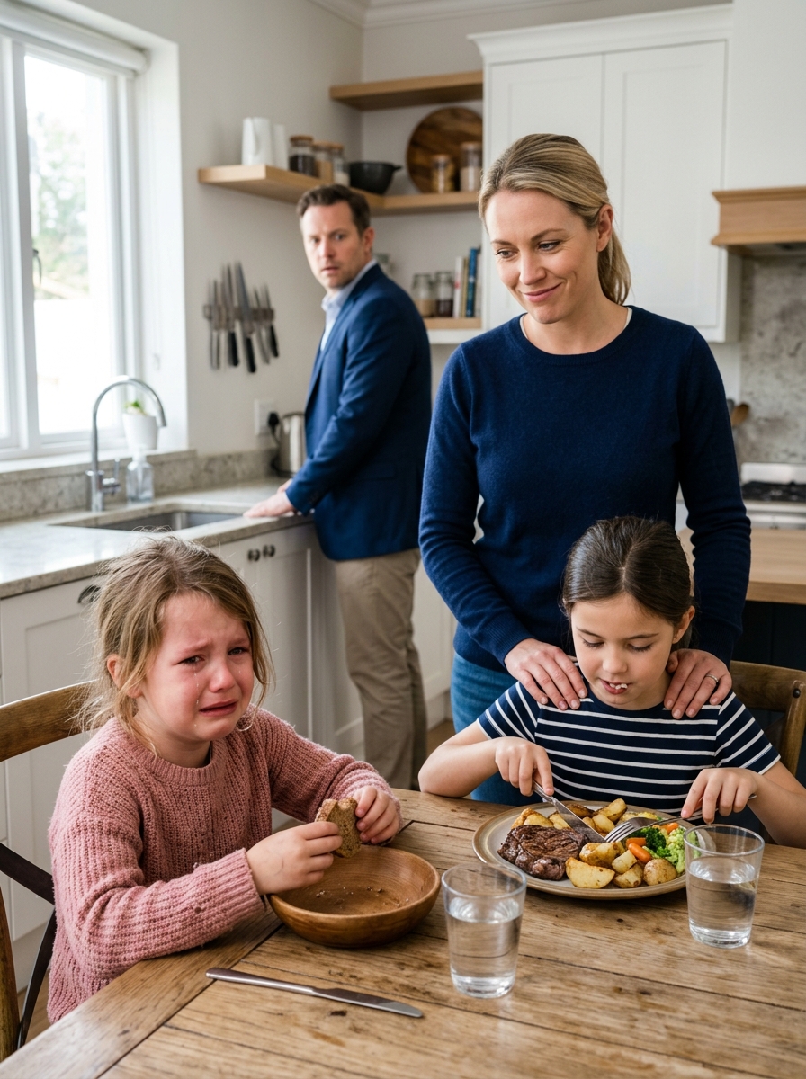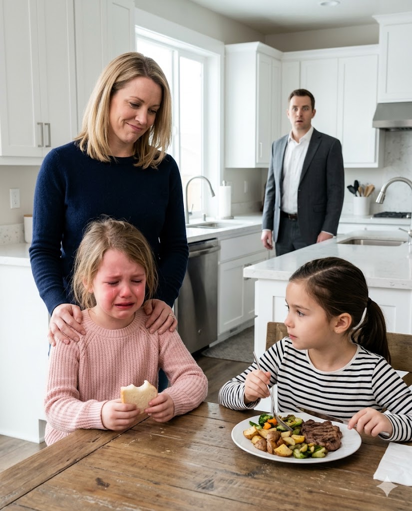 Across from her sat her stepsister, Olivia—eight years old, cheeks healthy, hair neatly brushed back, posture relaxed as she cut into a tender piece of steak with golden roasted potatoes still steaming beside it. She ate comfortably, slowly, without ever needing to ask for what was already hers.