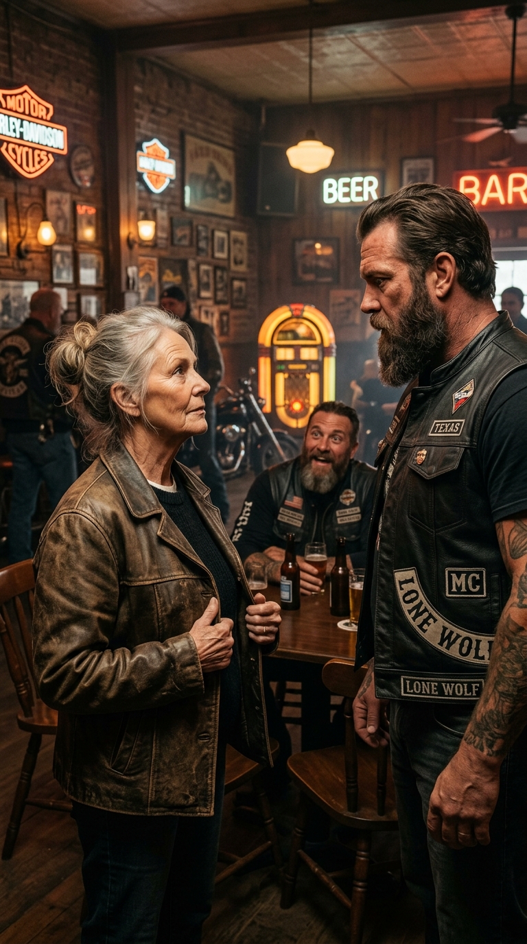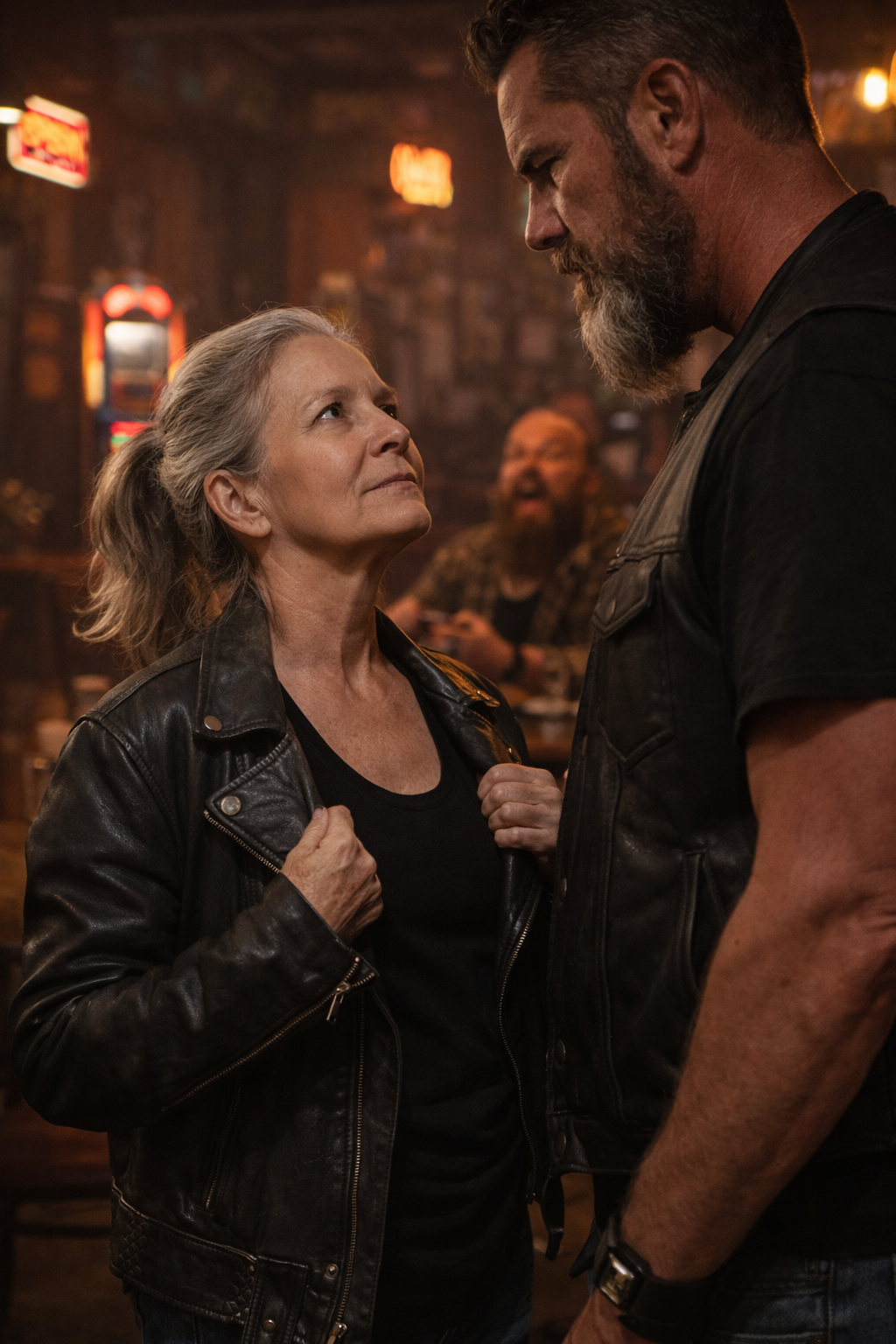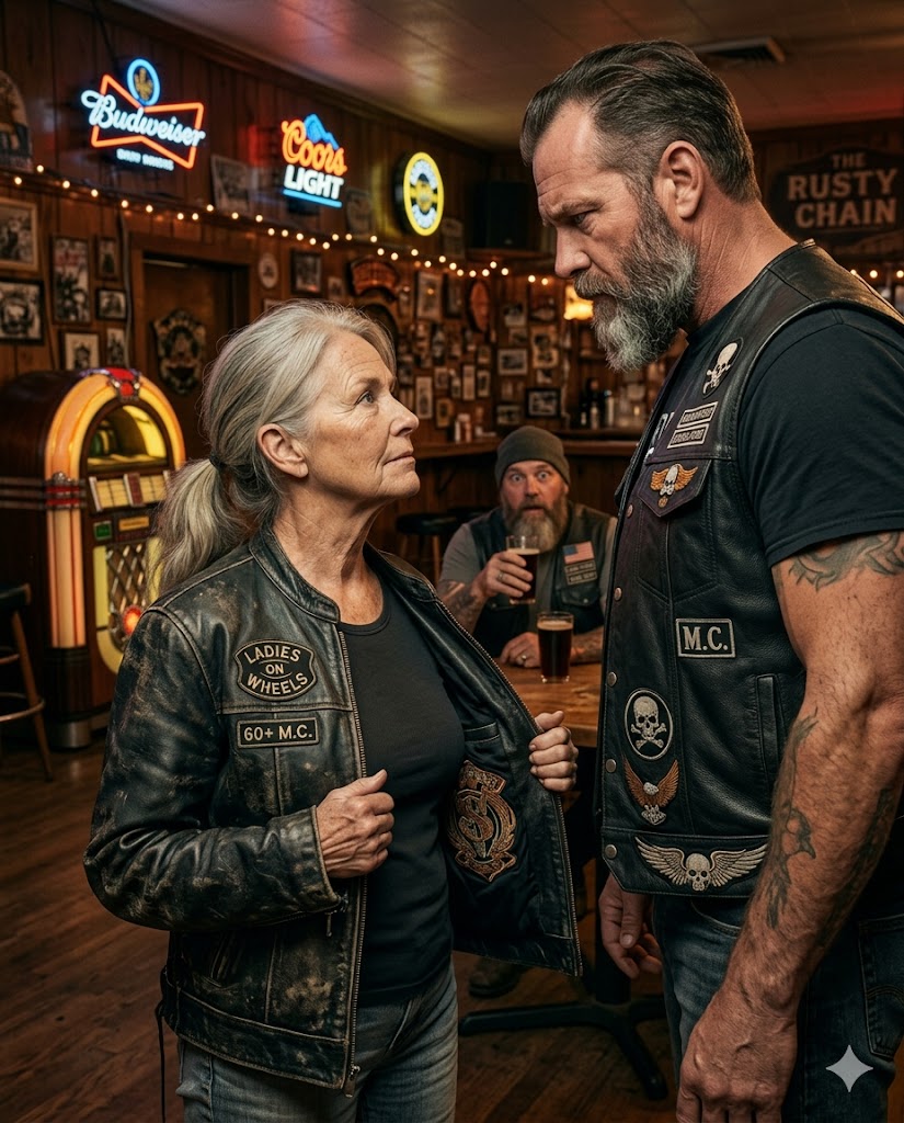 The bald biker at the center smirked at her as if she didn’t belong there at all.