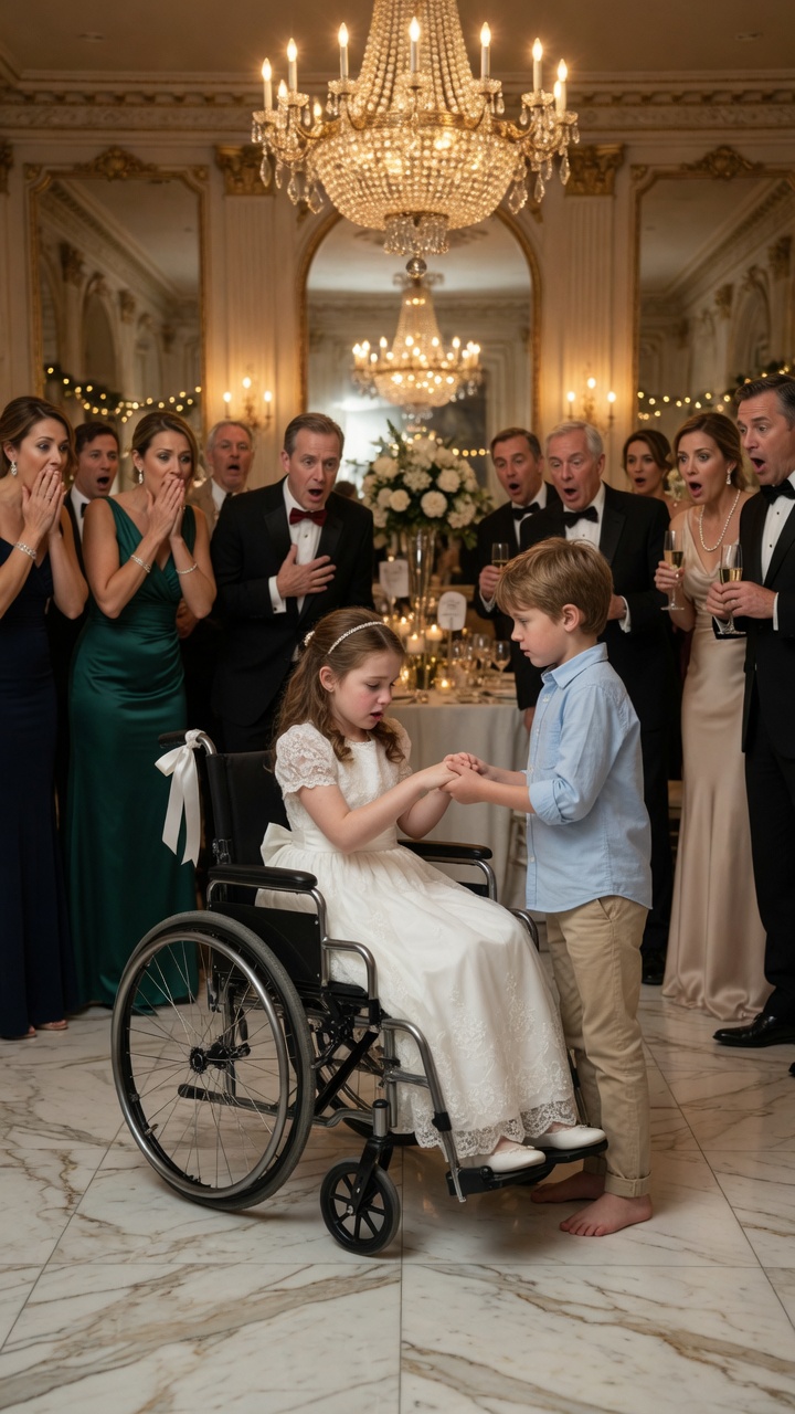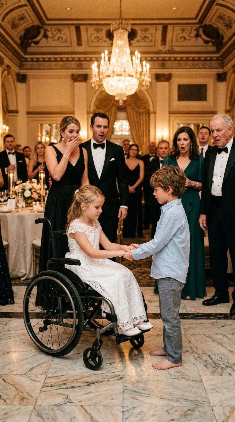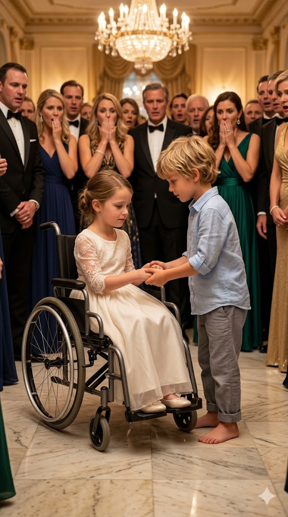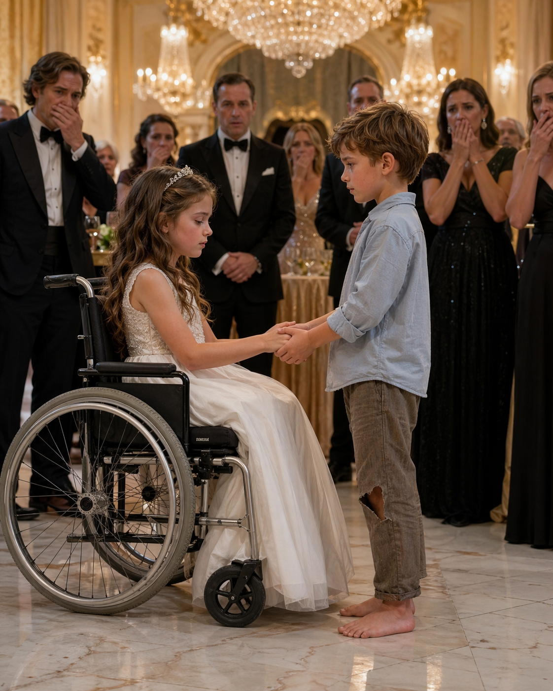 He was barefoot, his feet marked by the dust and cold of streets that told stories no one inside the ballroom had ever lived, while his clothes—faded, worn, and slightly too large—stood in stark contrast to the luxury surrounding him.