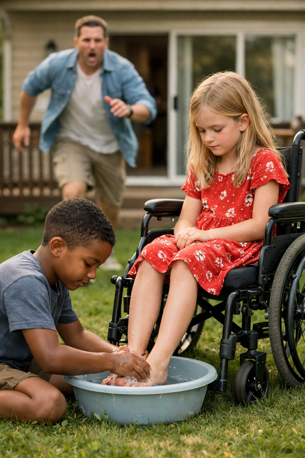 Behind them, her father was closer now, footsteps cutting through the grass, panic written across his face. But the children still held the center of the moment.