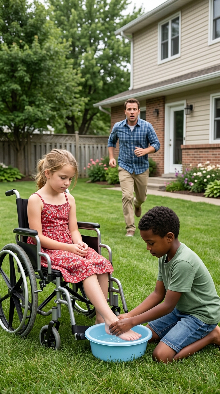 The backyard felt almost too calm for the grief sitting inside it. A bright green lawn, a large blurred house in the distance, sunlight breaking gently across the water. And at the center, a girl in a wheelchair, staring down at her bare feet as if they didn’t belong to her anymore.