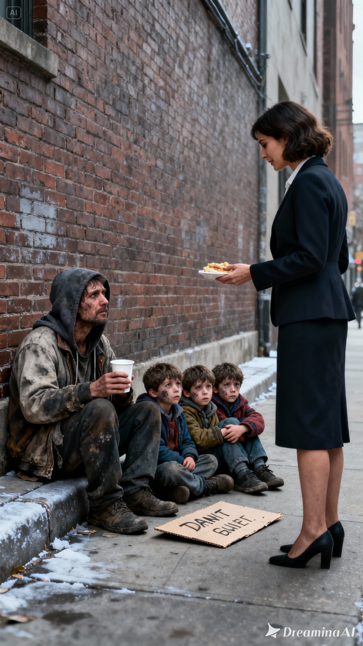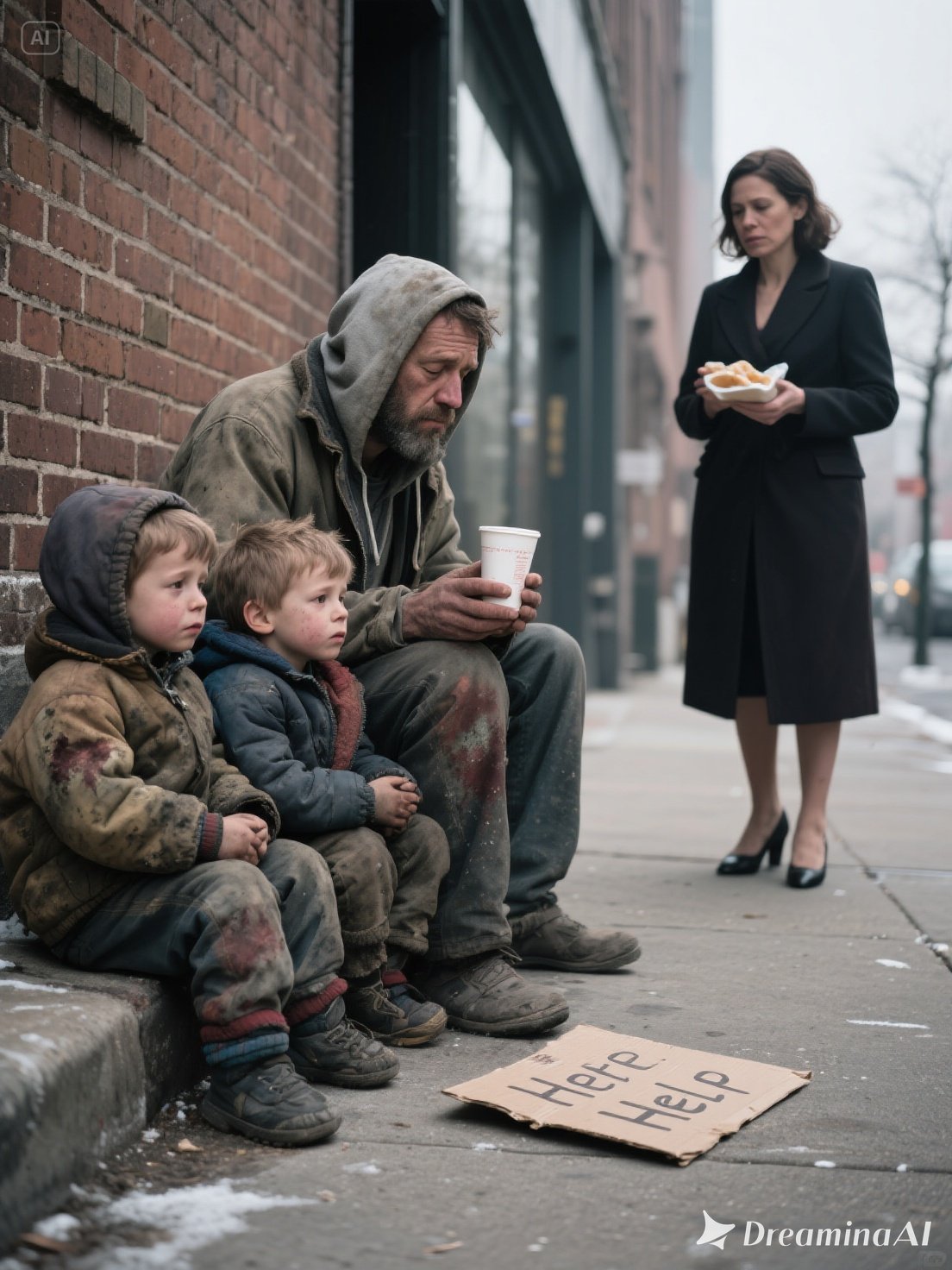 Ariel came to a sudden stop on the sidewalk. A tired-looking father was seated on the curb beside three small boys and a cardboard sign asking for food. The triplets were filthy, their faces streaked with tears, and one of them shivered from the cold. Pedestrians passed by as if the four of them didn’t exist. Someone even knocked over their coin cup, sending loose change skittering across the concrete.