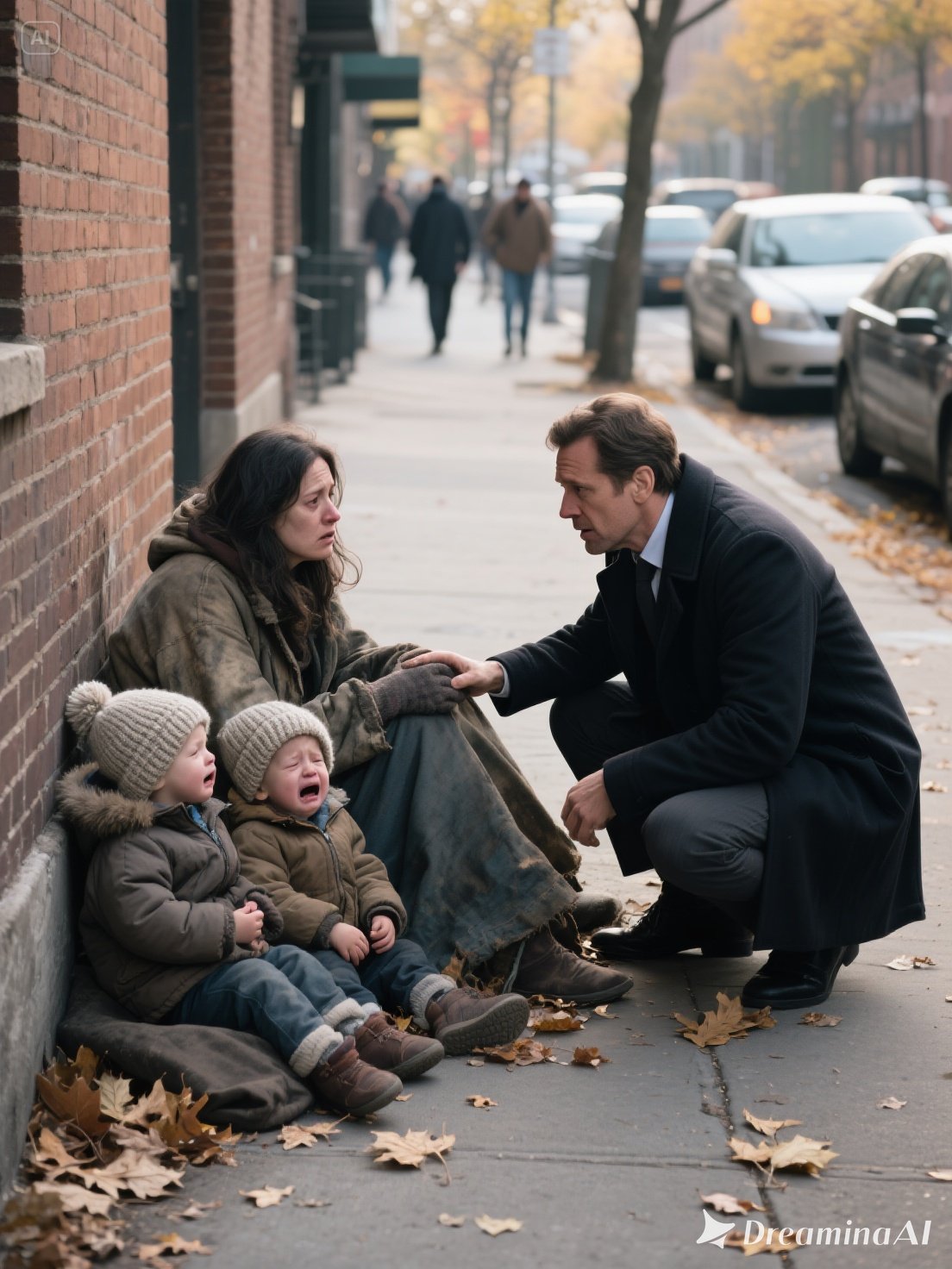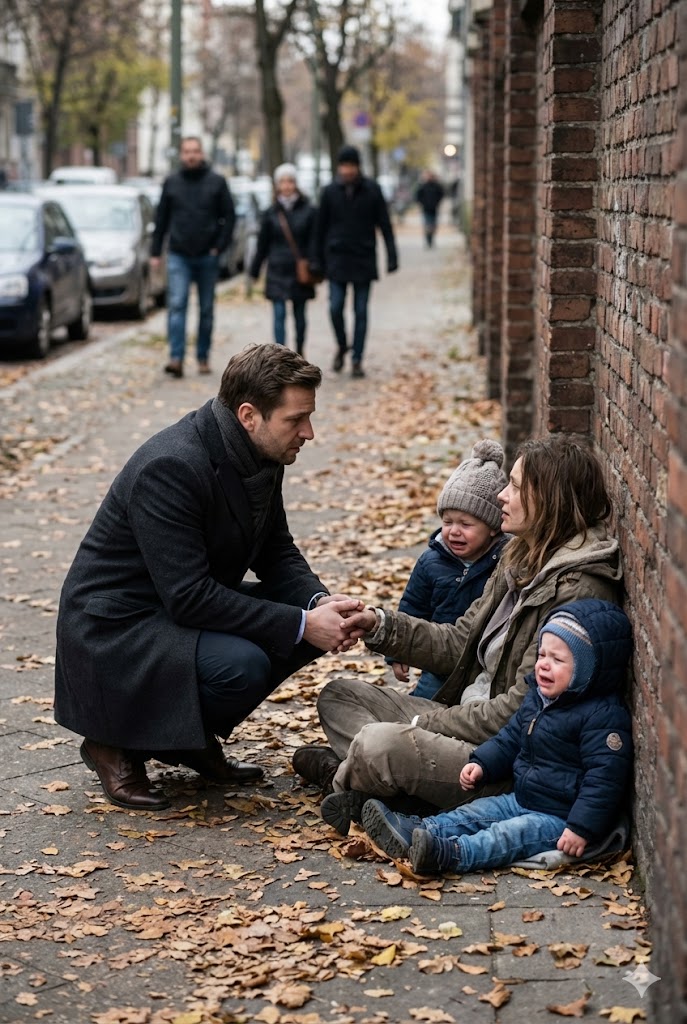 Stepping into the cold, the city noise faded under the children’s sobs. Up close, the woman’s face was pale and drawn, lips cracked, breathing shallow. The twins’ cheeks were streaked with dirt and tears, their tiny hands gripping her sleeve.