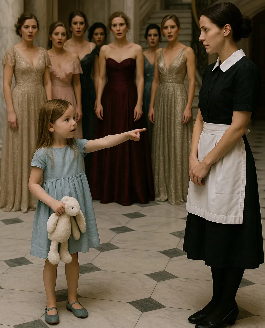 His daughter Amelia, only six years old, stood at the center of the marble floor in her sky-blue dress, clutching her stuffed rabbit. Her tiny finger pointed straight at Clara—the maid.