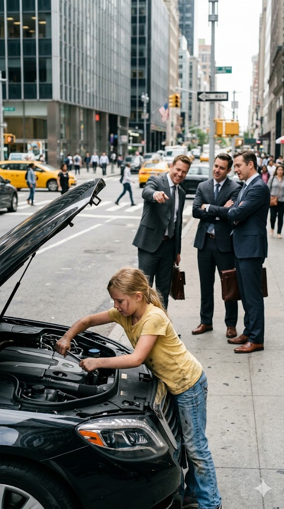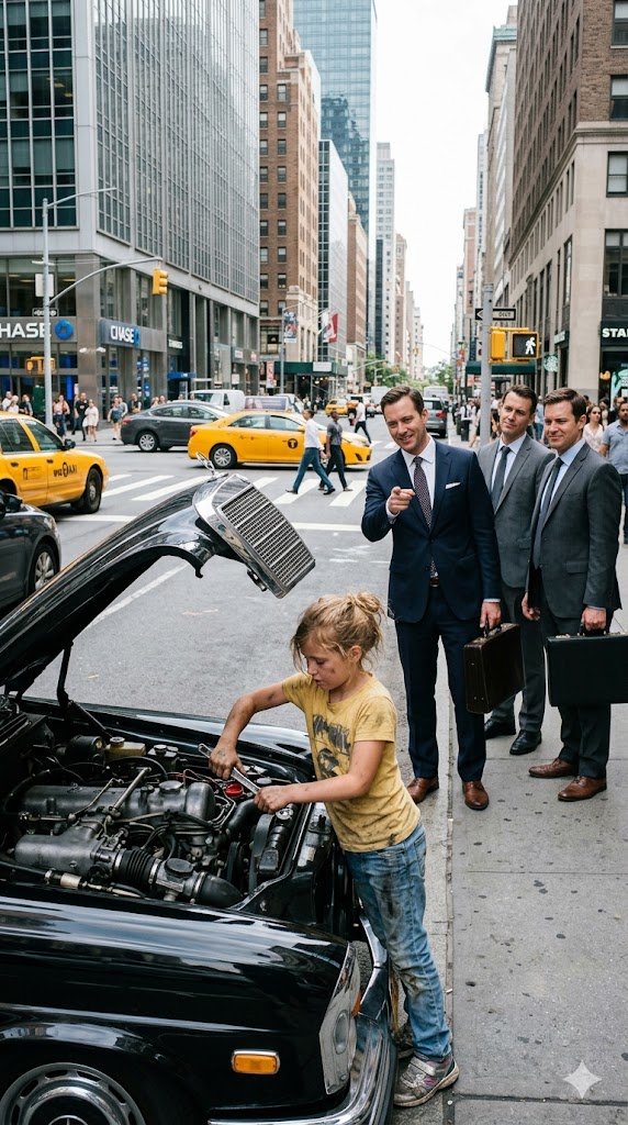 The black luxury sedan cruised down the avenue as if it owned the road, its polished surface gleaming like a mirror and catching glances from passersby. It carried that effortless confidence for one last second—then suddenly jerked forward, sputtered, and came to a complete stop beside the curb.