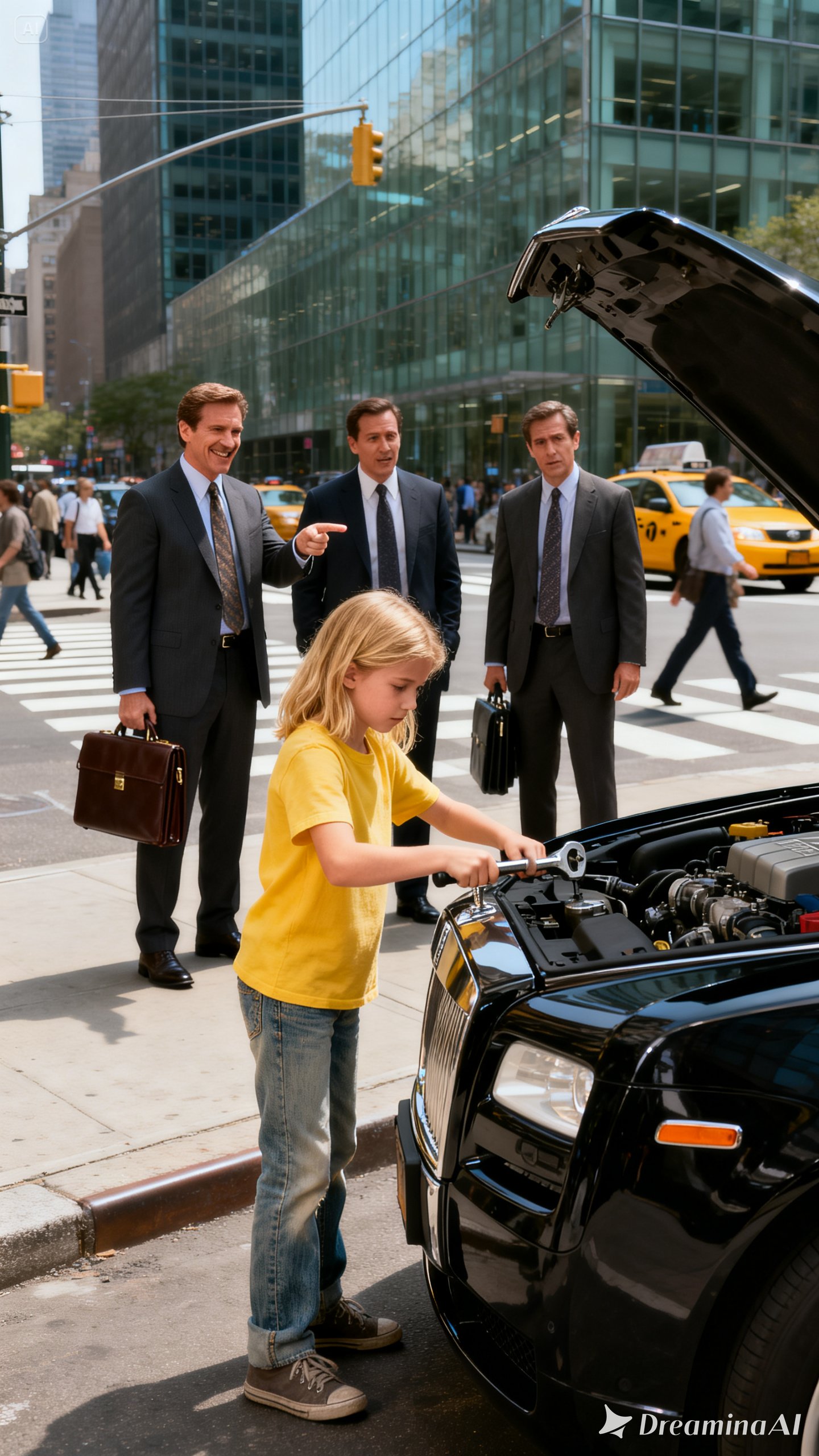 A few steps away, three young men had already stopped to watch. One raised his phone. Another grinned at the sight of a billionaire stranded in the middle of downtown traffic, his expensive shoes planted uselessly on the pavement.