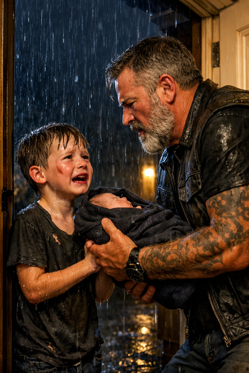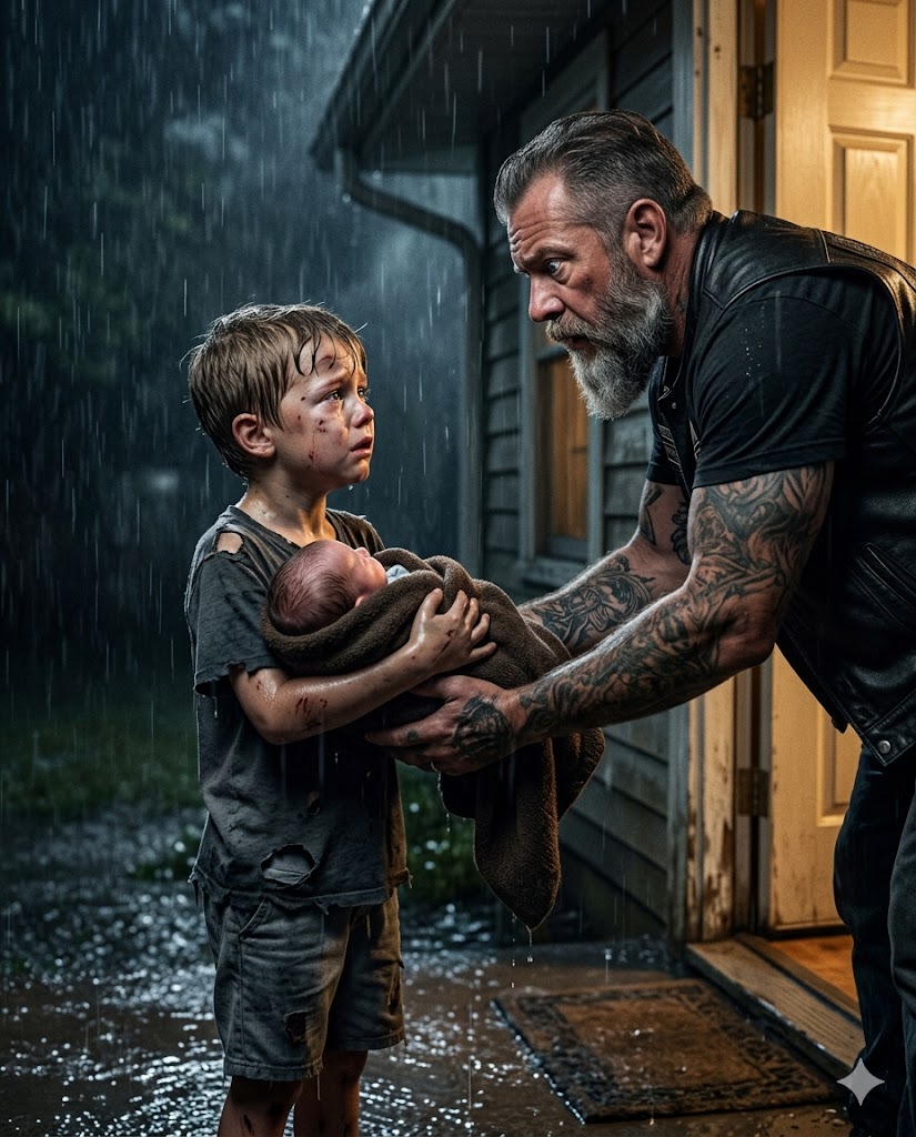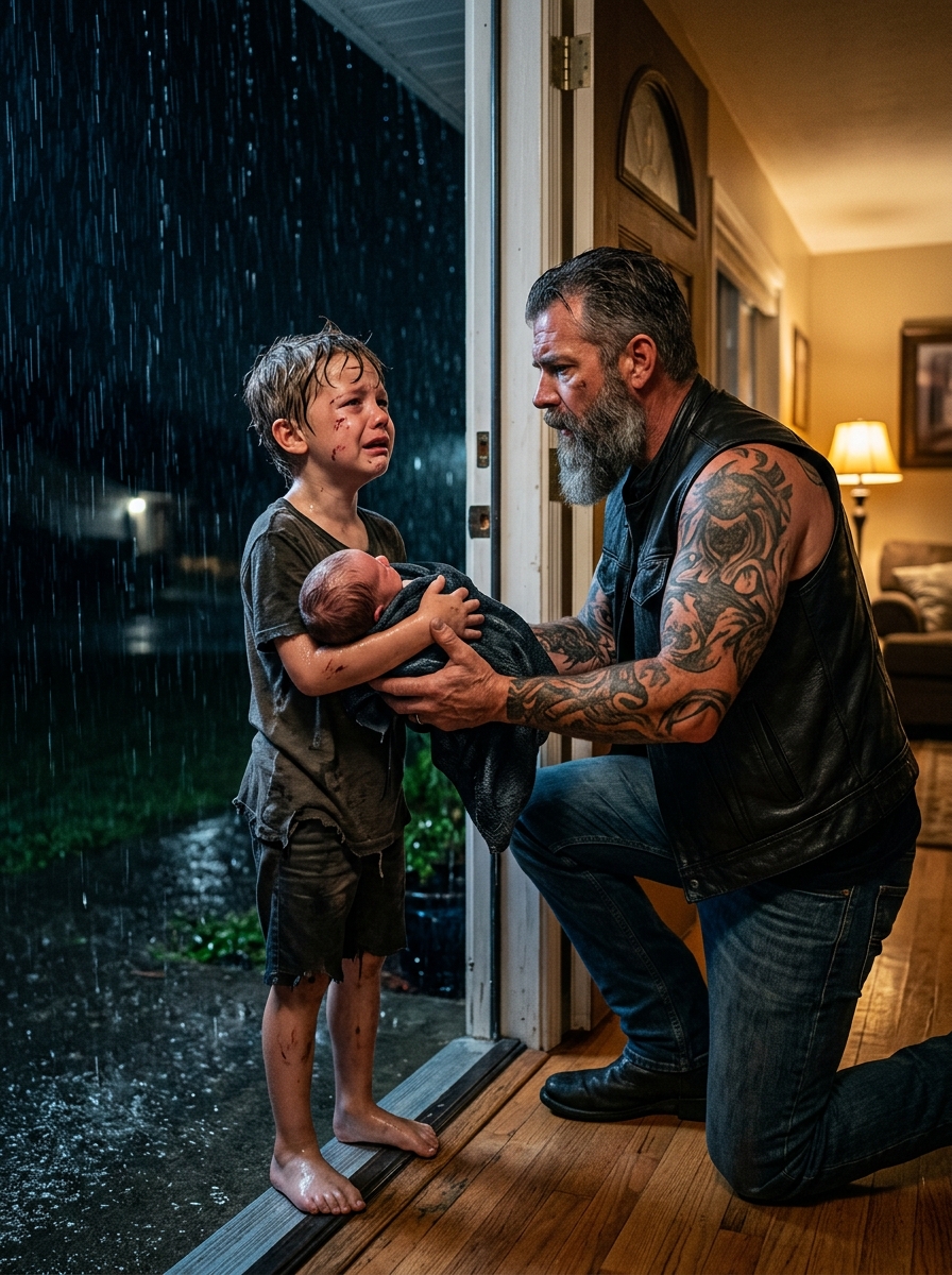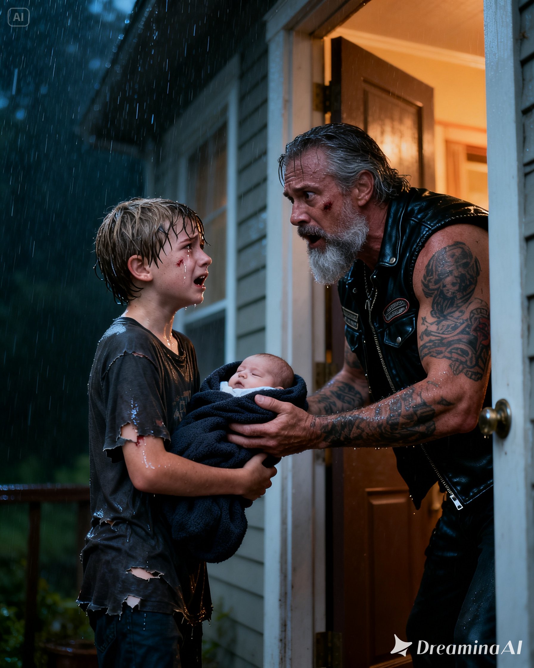 Nobody polite comes to a biker clubhouse in a storm unless they’re desperate or foolish, and the kid on the porch was definitely not foolish. He was maybe twelve. Soaked through. Barefoot in one sock. A split in his hairline leaking thin blood down one temple. And in his arms, wrapped in a wet pink blanket, was a little girl too small to understand she was shaking.