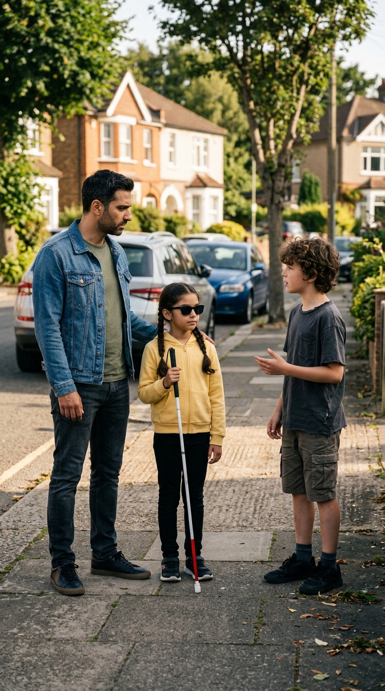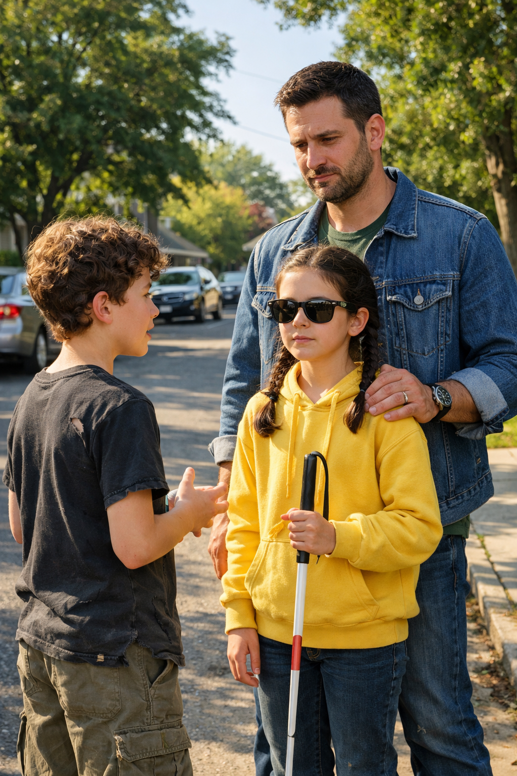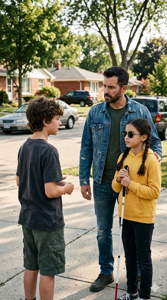 Daniel Carter held his daughter’s hand tightly as they walked along the sidewalk. His grip was steady, protective—almost too tight. Beside him, nine-year-old Emily moved carefully, tapping her white cane against the ground in a steady rhythm. Dark glasses covered her eyes, but they couldn’t hide the gentle innocence on her face.