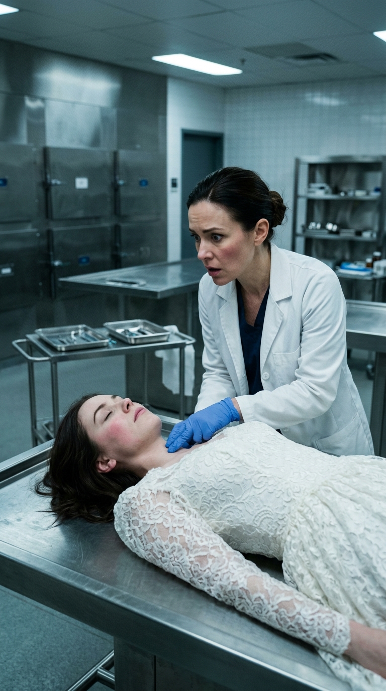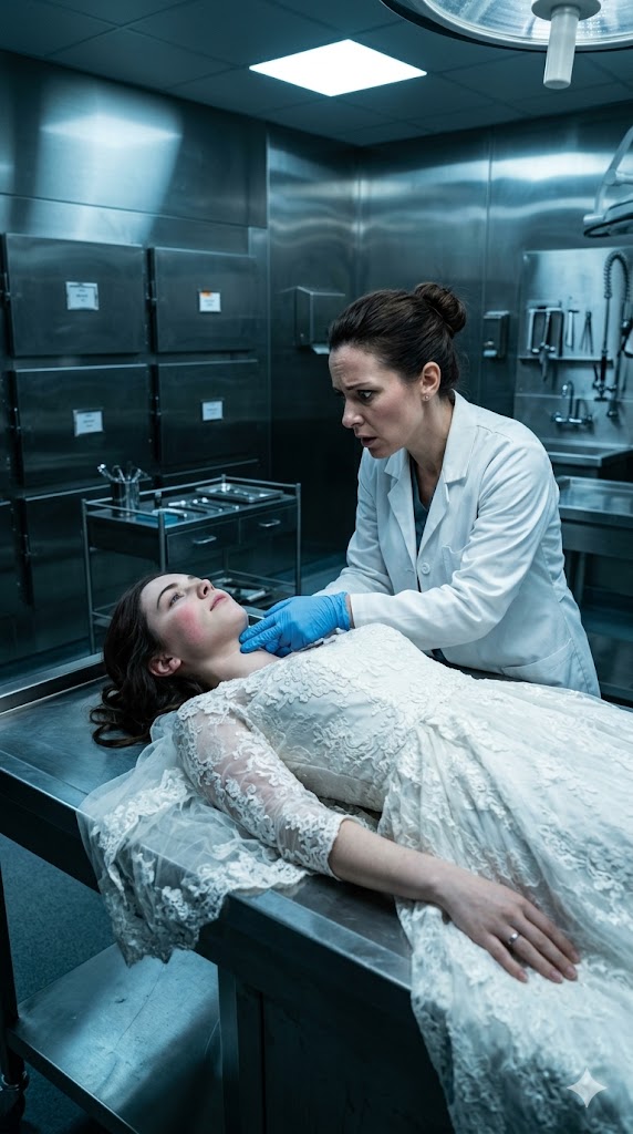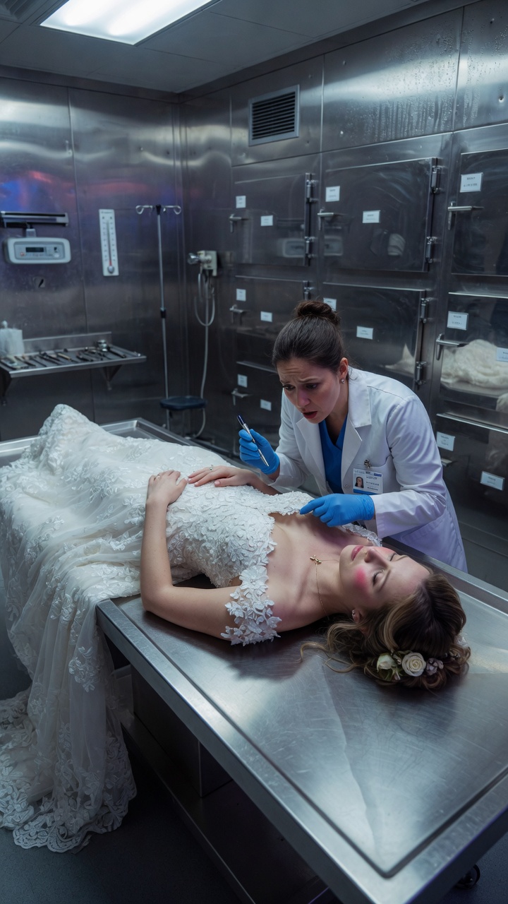 The attendant remained alone. She stepped closer to the table. The bride looked too peaceful. Her skin was not gray. Her lips were not blue. Her cheeks seemed to glow with a faint blush.