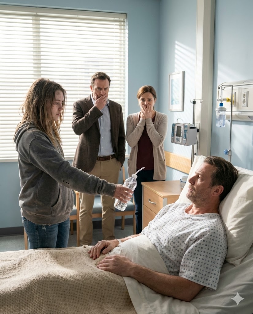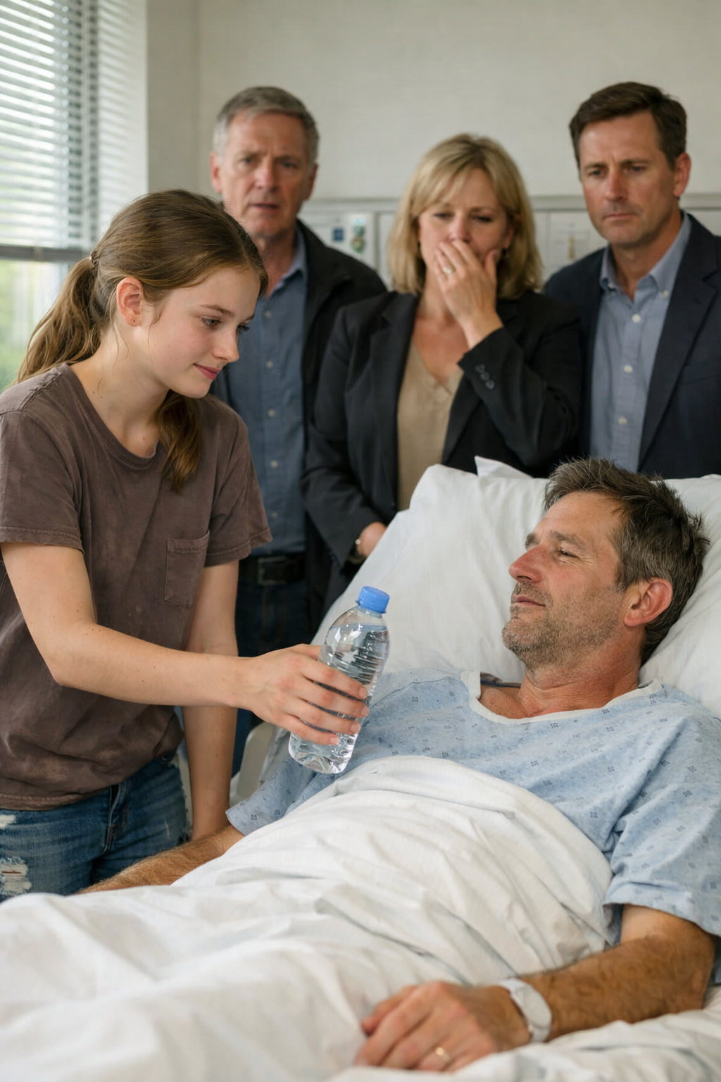 “This water,” she said quietly, lifting the bottle just enough to be seen, “is the reason he’s lying there.”