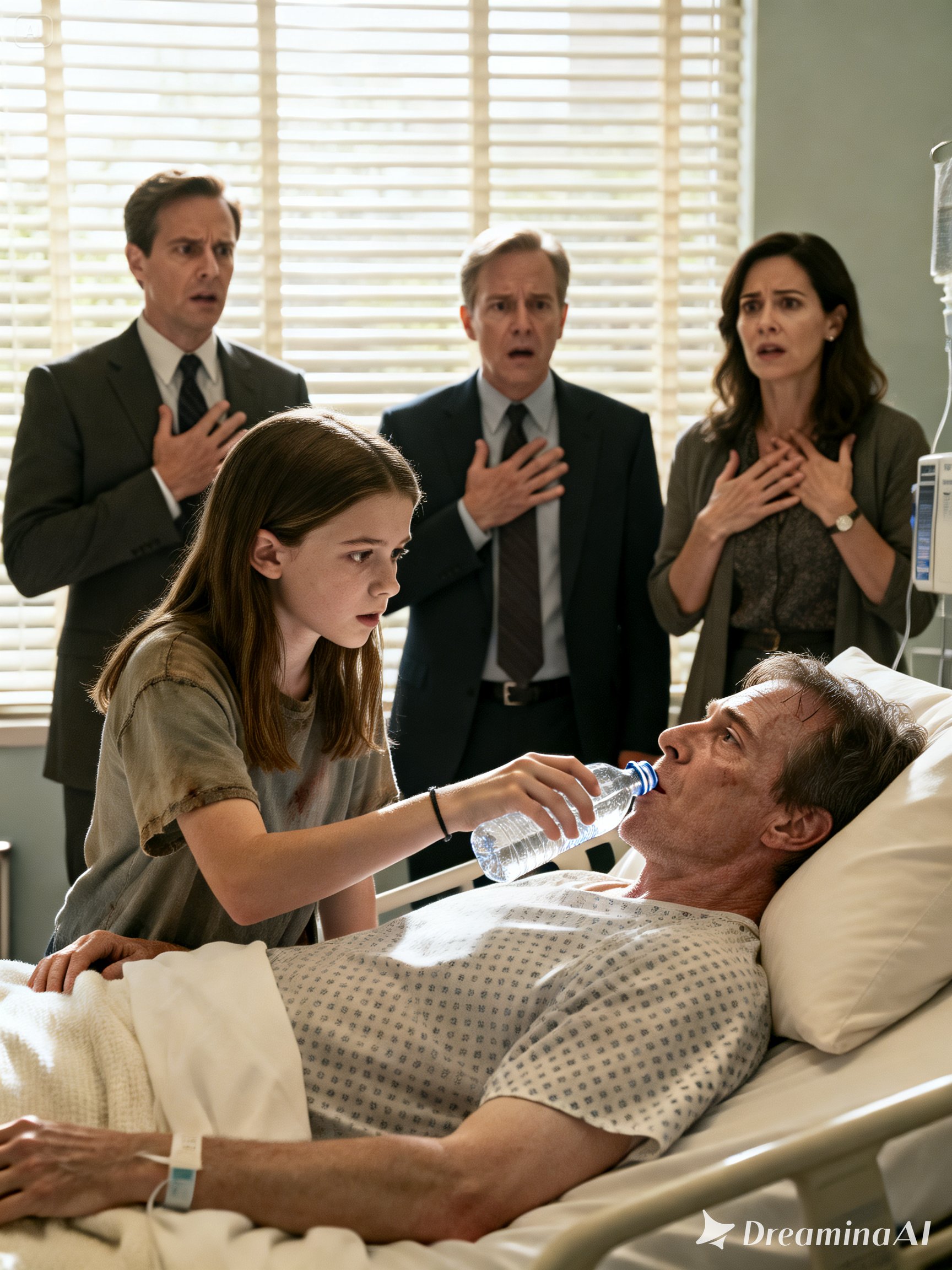 The girl stepped inside barefoot, the hem of her dress damp, dark strands of hair clinging to her neck as though she had come in from rain rather than city streets. In her hands, she held a small, worn plastic bottle—scratched, cloudy, its cap slightly bent. The water inside was clear enough to appear harmless.