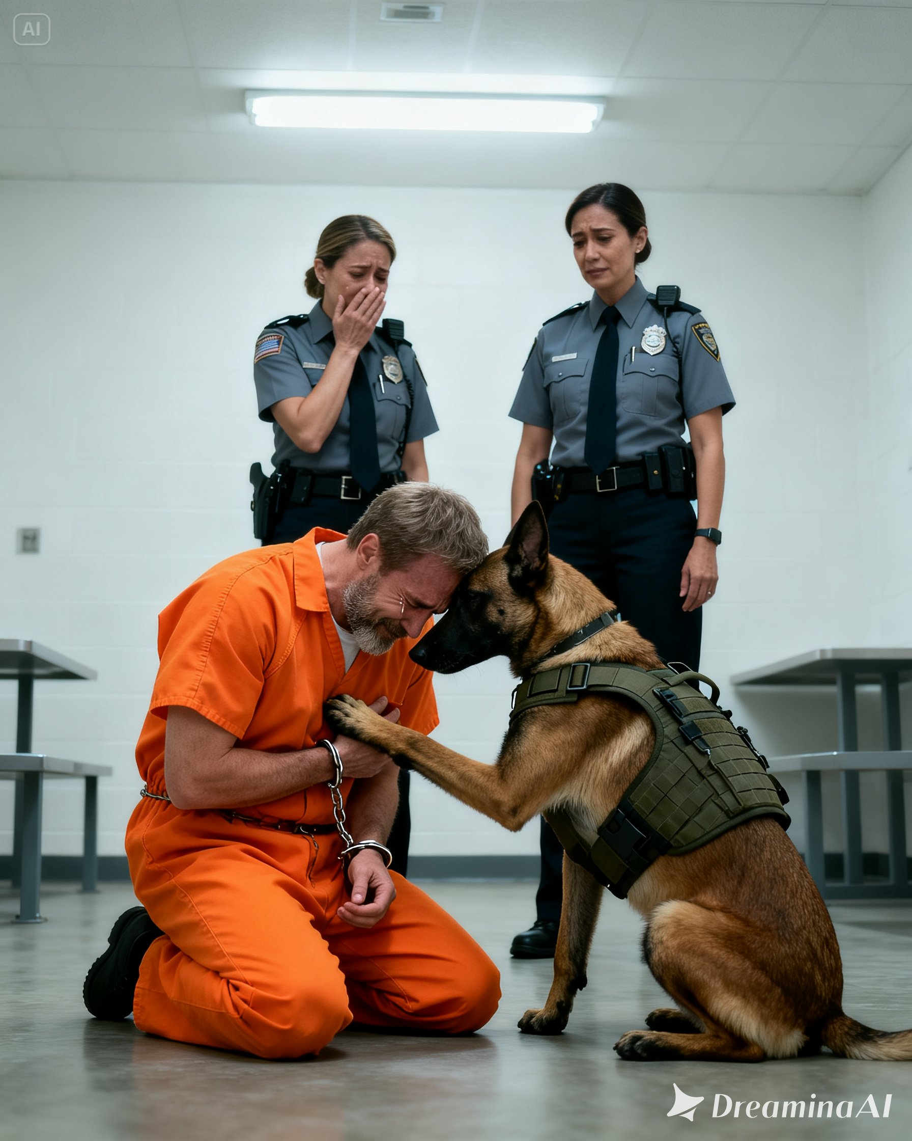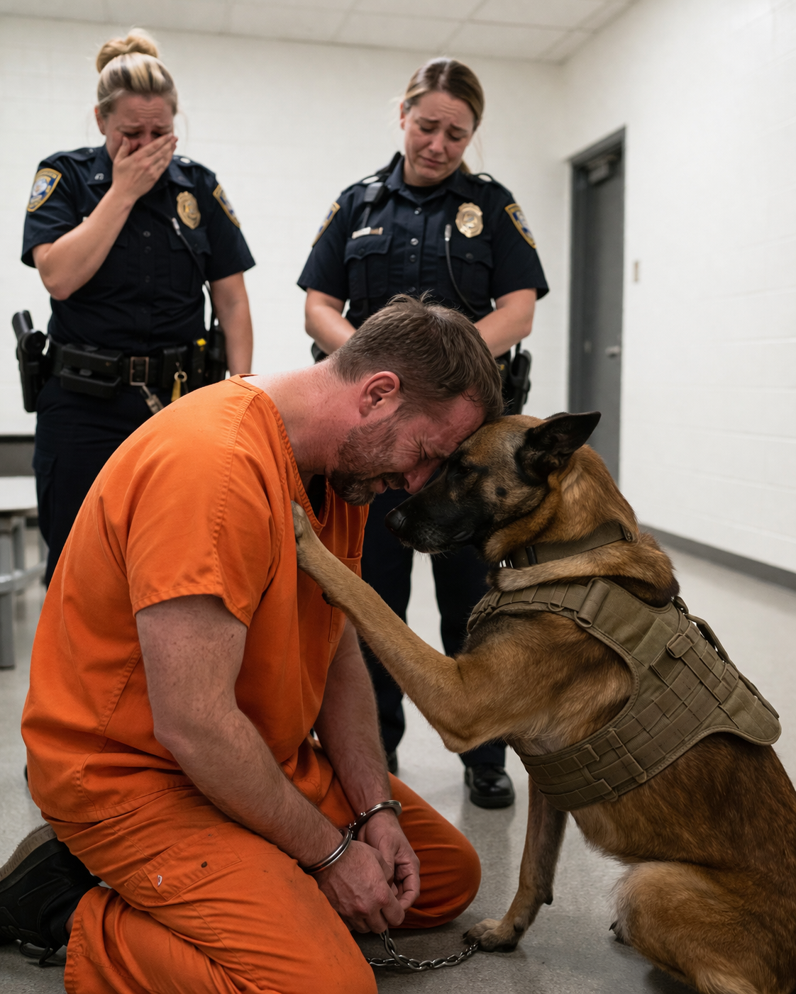 The guards stepped forward, signaling the transition. One of them reached gently toward the dog, preparing to separate it as procedure required. The leash tightened again, and the dog resisted for a brief moment, not violently, but with absolute refusal, its body shifting instinctively between Ethan and the opening door.