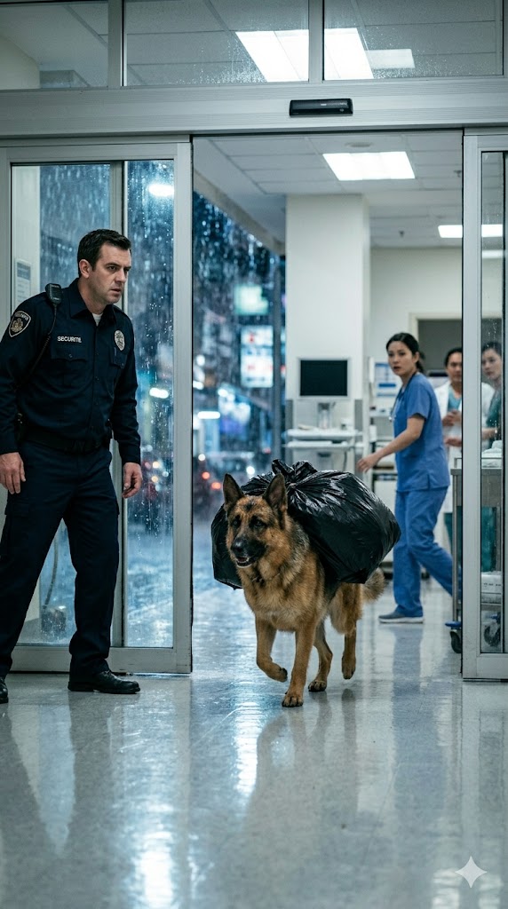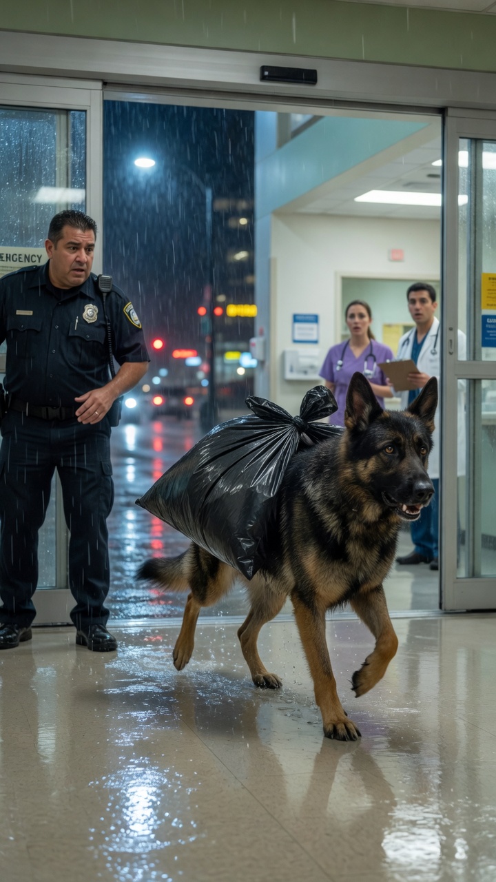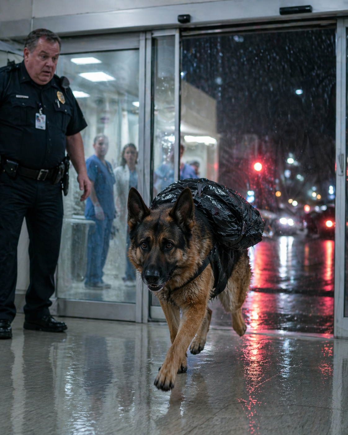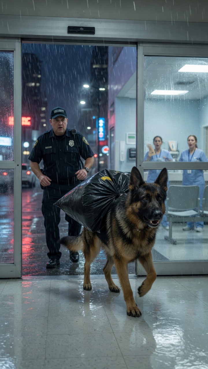 The dog was drenched from head to tail, rainwater dripping from its fur onto the polished floor. Its chest rose and fell rapidly, sides heaving with exhaustion, and its dark coat glistened under the fluorescent lights. But what caught everyone’s attention wasn’t the dog itself.