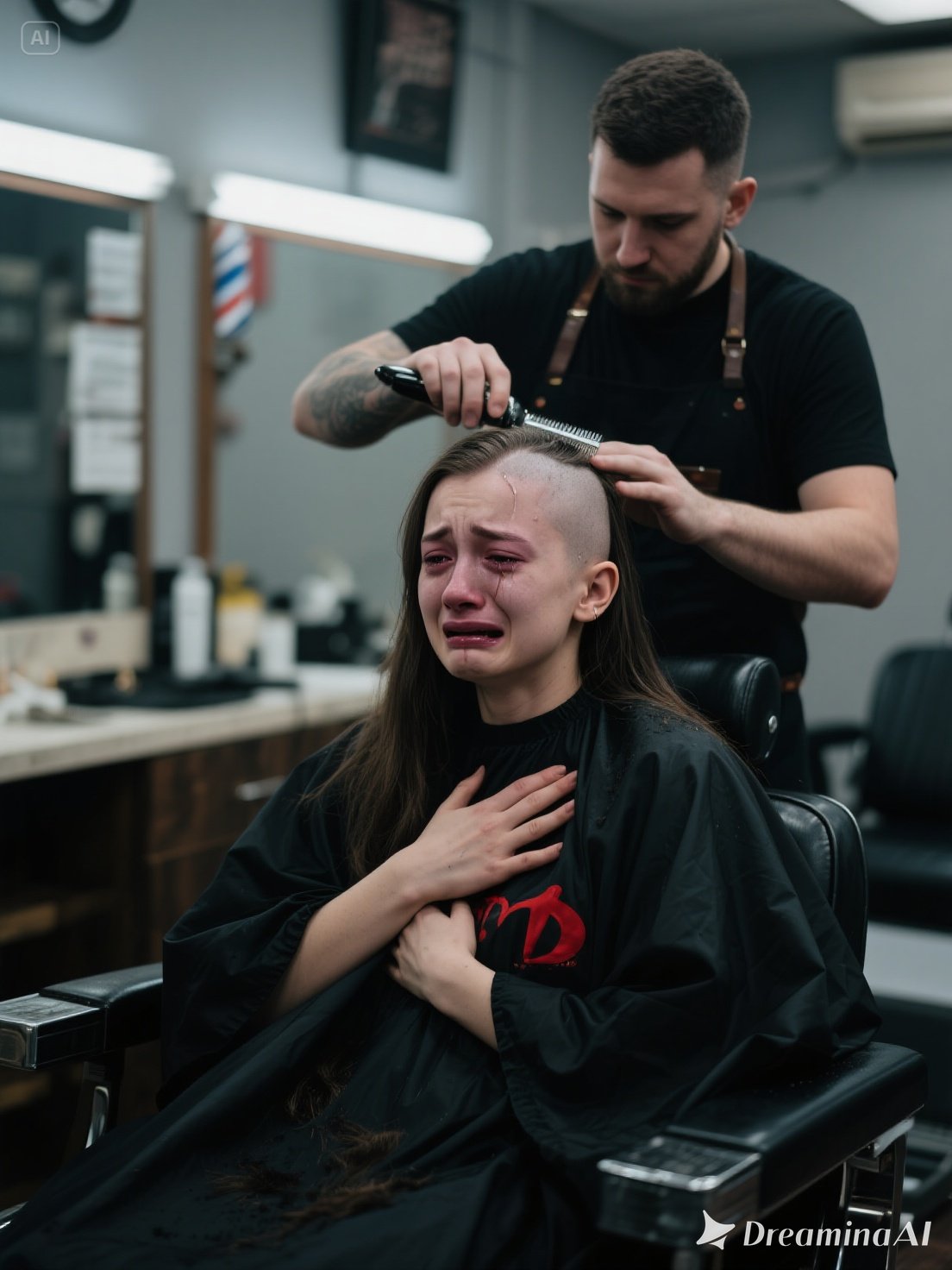 The barber laid a gentle hand on her shoulder, but words failed him. She trembled, feeling as though pieces of her identity and strength fell with each strand.