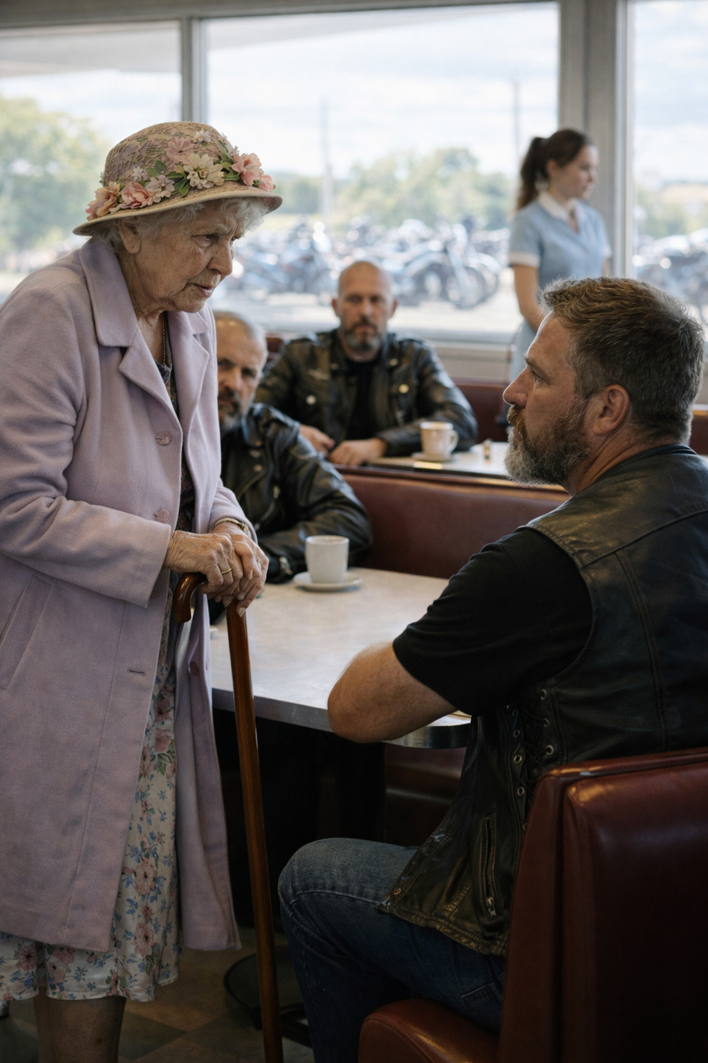 She wore a pale lavender coat, buttoned carefully, and a small hat that had likely belonged to better days—years when she and her husband drove into town every Sunday after church, sitting at the same corner table, sharing pie with two forks. Her hands trembled slightly as she paused near the entrance, letting her eyes adjust.