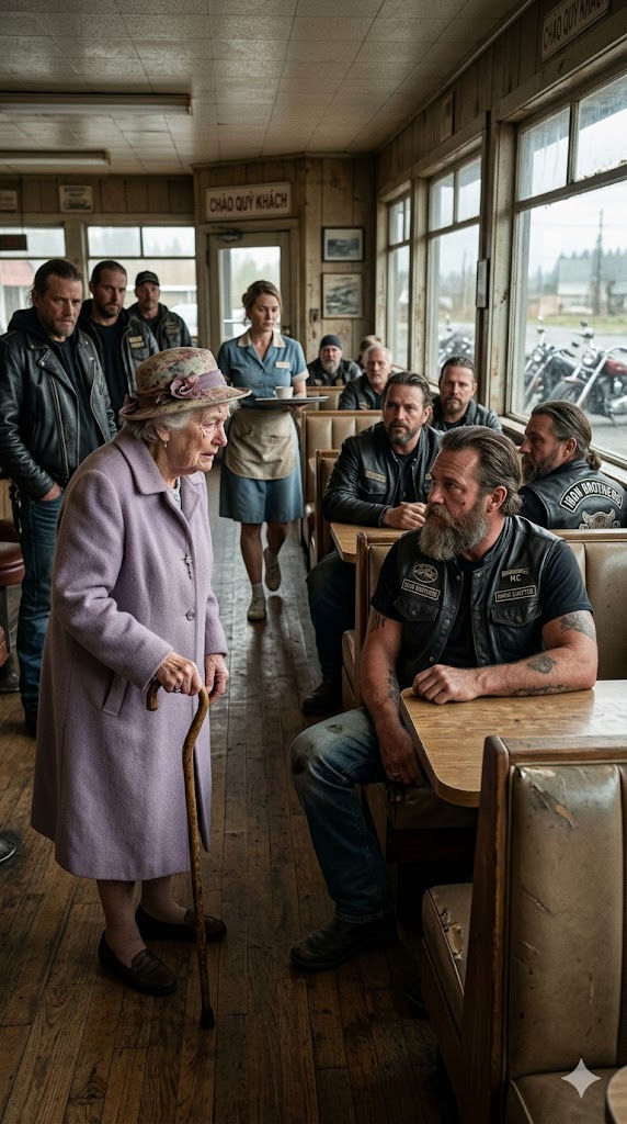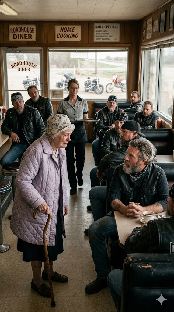 She sat alone in a booth, menu open but unread. Every few moments, she glanced at the bikers by the window. Strong, loud in appearance, impossible to ignore from a distance—but with something about the older man’s posture that spoke of respect rather than threat.