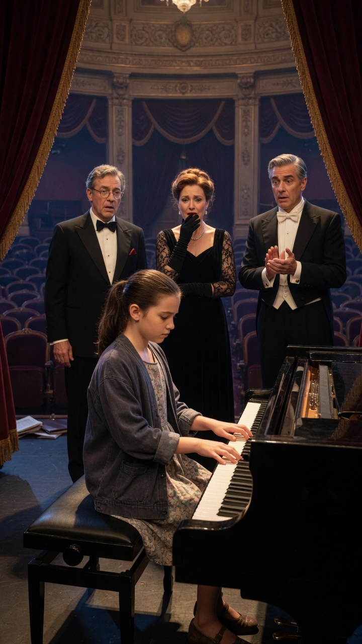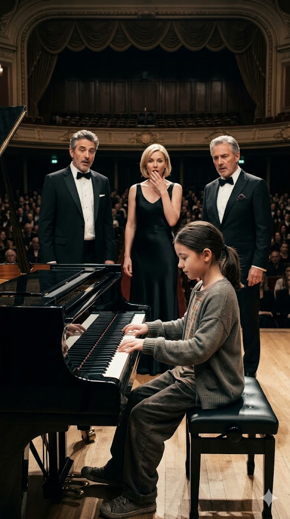 The grand auditorium of the City Conservatory of Music glowed under the soft gleam of crystal chandeliers that hung like frozen stars from the high ceiling. Heavy velvet drapes in deep crimson framed the stage, and rows of plush seats upholstered in rich burgundy velvet held an audience dressed in their finest evening attire. Men in tailored tuxedos and women in shimmering gowns and pearl necklaces chatted quietly, their polished leather shoes tapping lightly against the marble aisles as they settled in for the annual student recital. The air carried the faint scent of expensive perfumes, freshly printed programs, and the subtle polish of the grand Steinway piano that dominated the center of the stage beneath a single warm spotlight. This was an evening meant for celebration, for proud parents to watch their children showcase years of disciplined practice, for applause to roll like thunder at the end of each flawless performance. The printed program listed names of talented young musicians from the city’s most affluent families, each piece chosen to highlight technical brilliance and artistic promise. No one expected anything out of the ordinary. The concert was supposed to begin with applause.