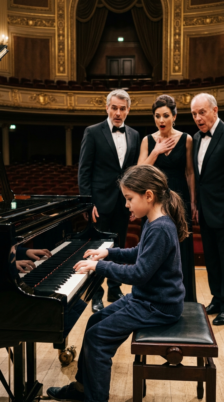 The wealthy parents who had been whispering only moments earlier now sat frozen in total silence, watching the man in the front row stare at the child on the piano bench. Programs slipped forgotten from laps onto the carpeted floor. A few phones that had been discreetly recording the recital were lowered without a sound. The warm spotlight on the stage now seemed to illuminate only the two of them — the girl and the man — while the rest of the world held its breath.