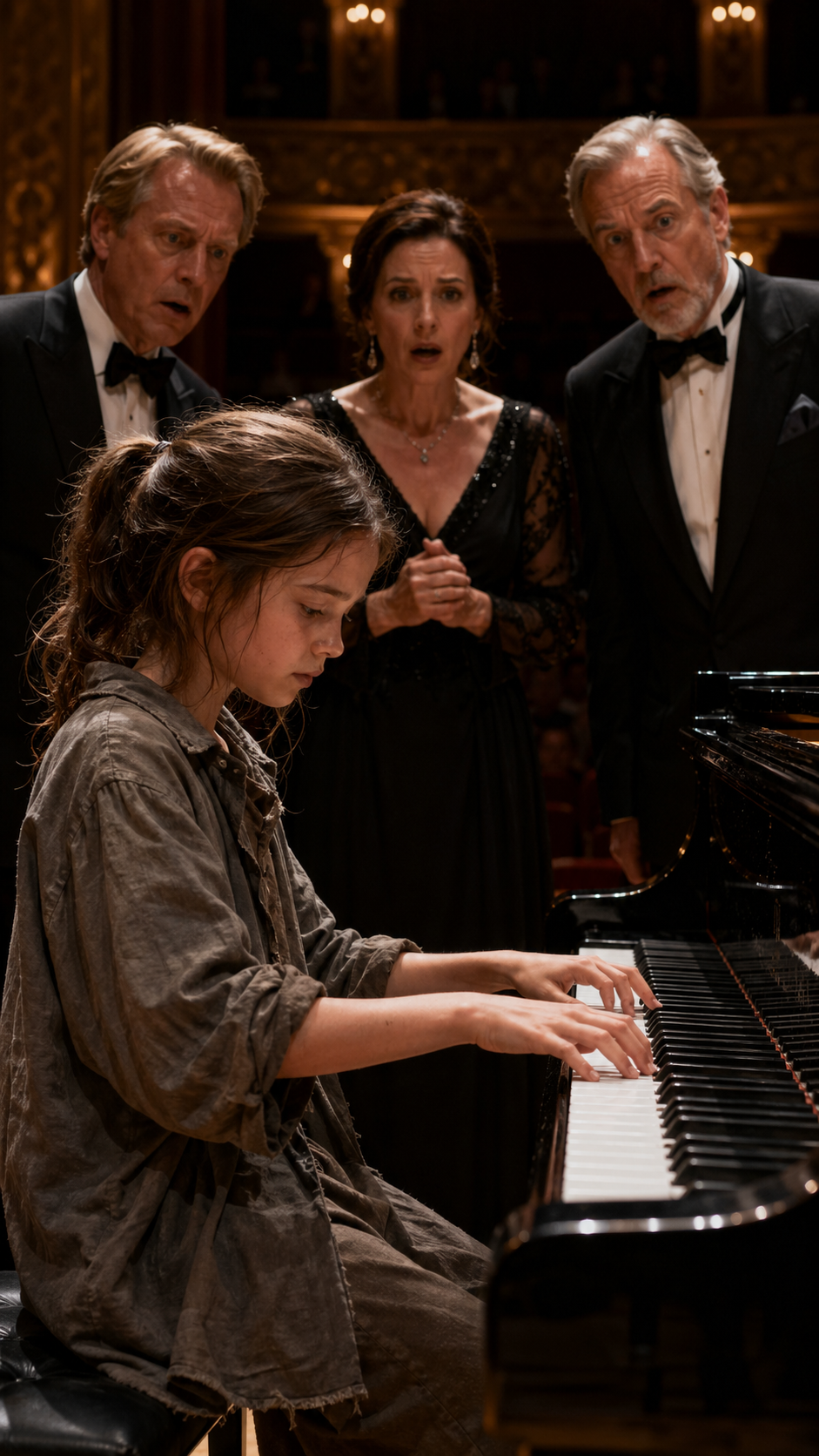 Two teachers in formal black attire rushed toward the stage from the wings, their faces flushed with alarm and embarrassment. But the girl was already sitting down on the polished bench, her small frame barely reaching the keys properly. She adjusted herself with careful, practiced movements, as if she had imagined this moment a thousand times during long, lonely nights on shelter cots or under park benches.
