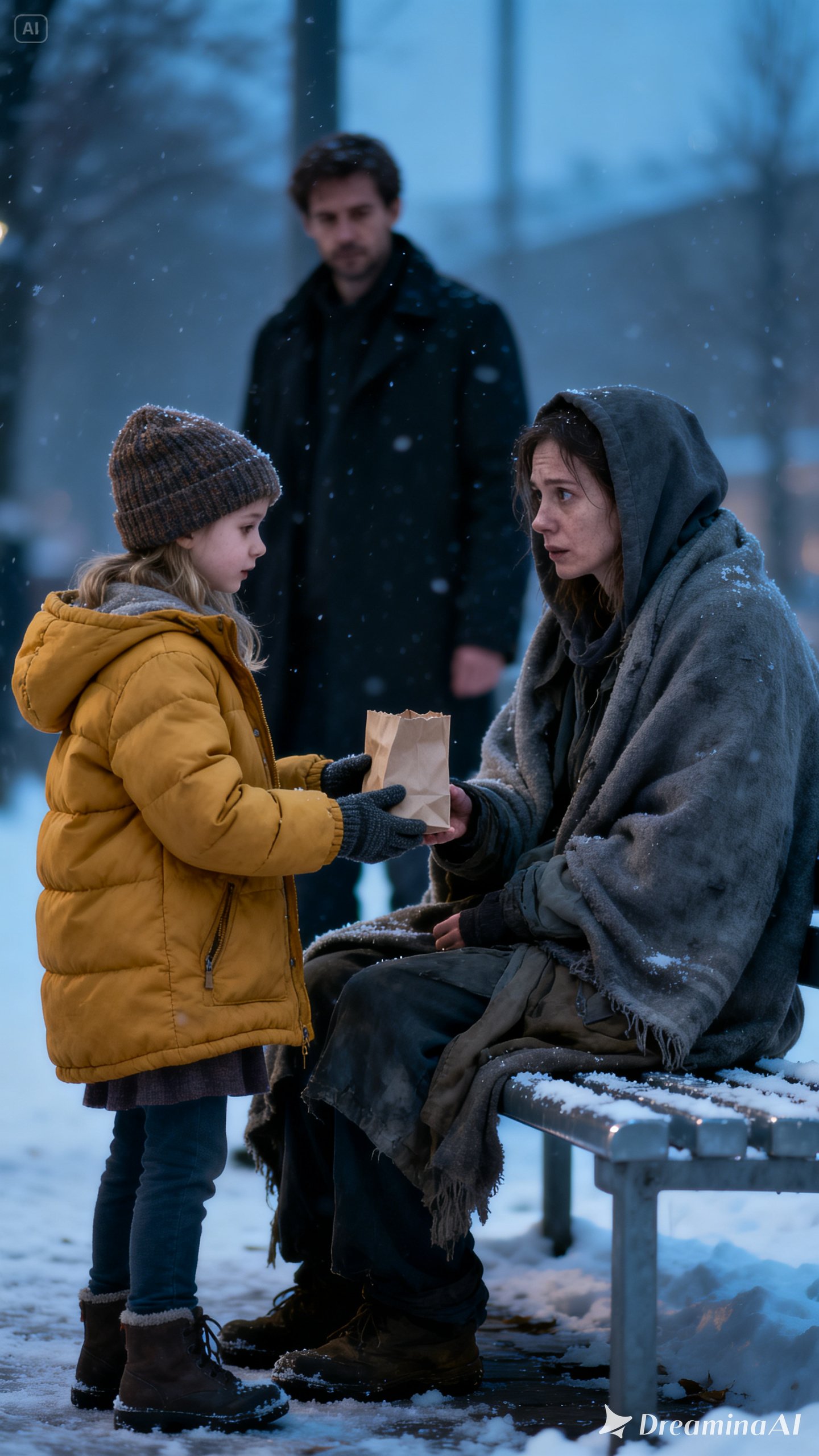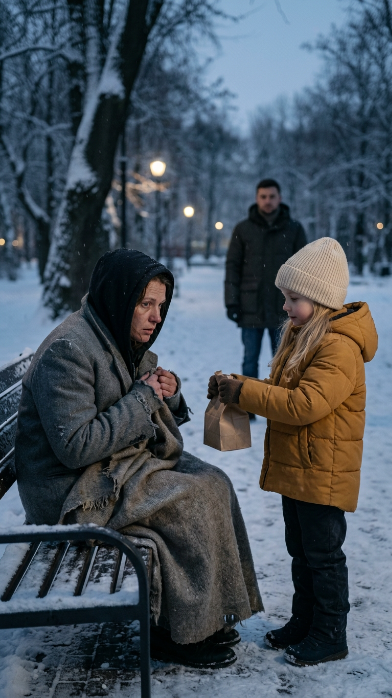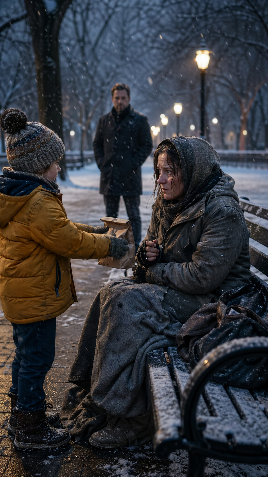 Snow settled into the woman’s tangled hair. The bag rested warm in her lap. For a brief moment, she looked less like someone the city had abandoned—and more like someone remembering what it meant to be seen.