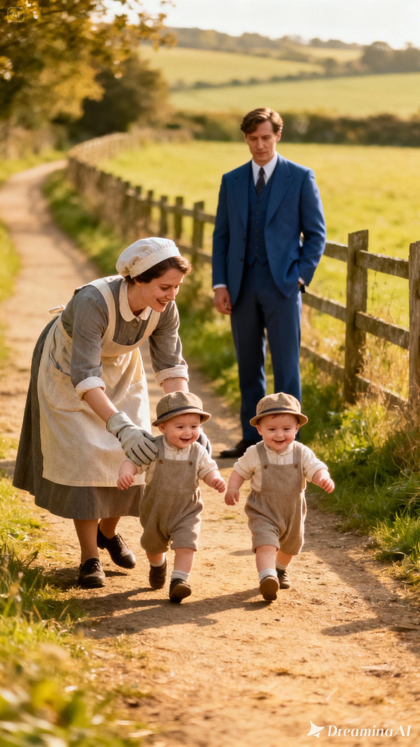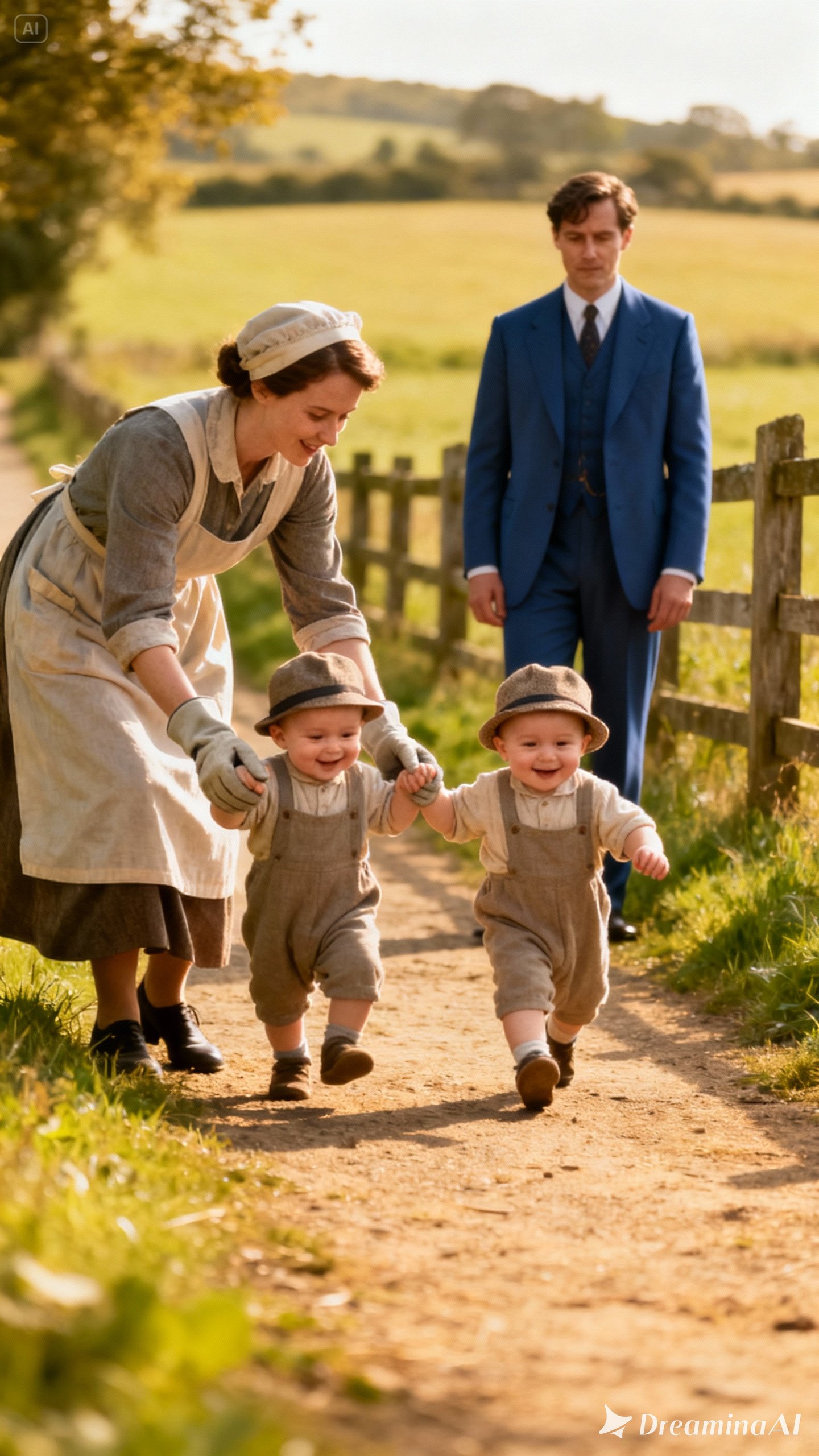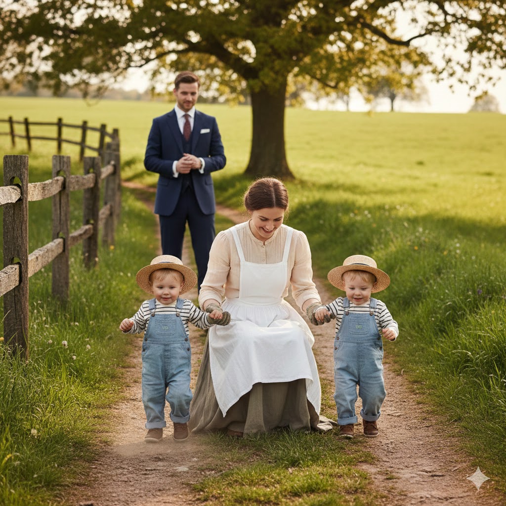 Twin boys, barely two years old, dressed in identical outfits—white shirts, striped overalls, tiny brown shoes. Their small hands were clasped together.