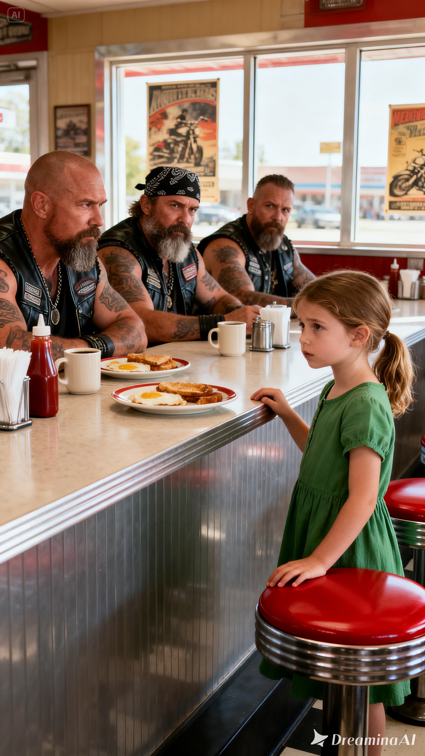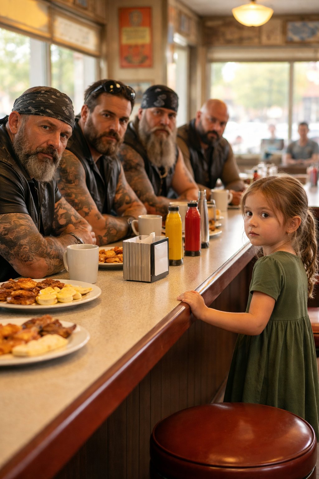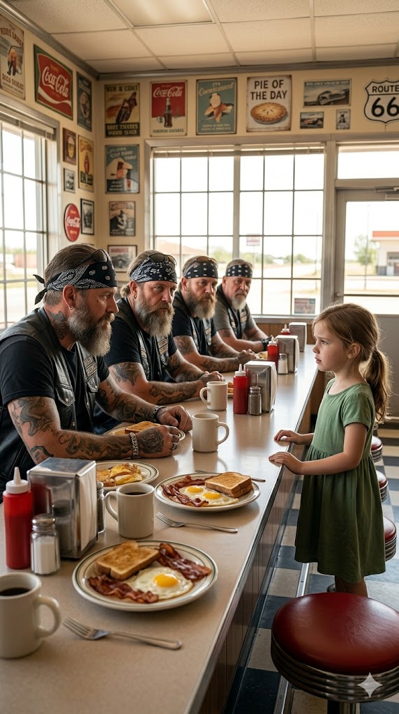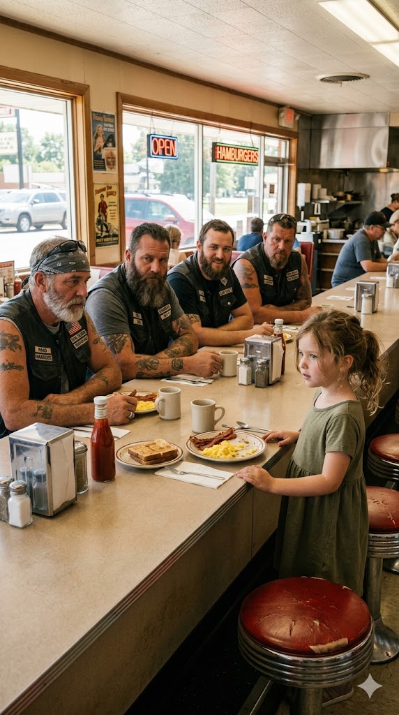 The diner’s front door swung open, and cold night air rushed in as the group stepped outside. Engines roared to life one by one until the parking lot filled with the deep thunder of motorcycles. To those inside, it must have looked like something from an old story—six towering men in leather gathering around one frightened little girl as if she were the most important person in the world.