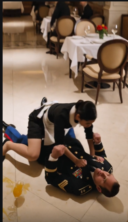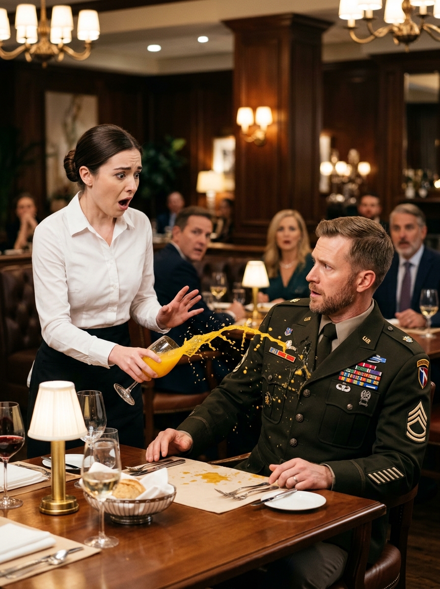 A young waitress hurried between tables carrying a tray of water glasses and orange juice when a man in a formal military uniform stepped back without looking.
