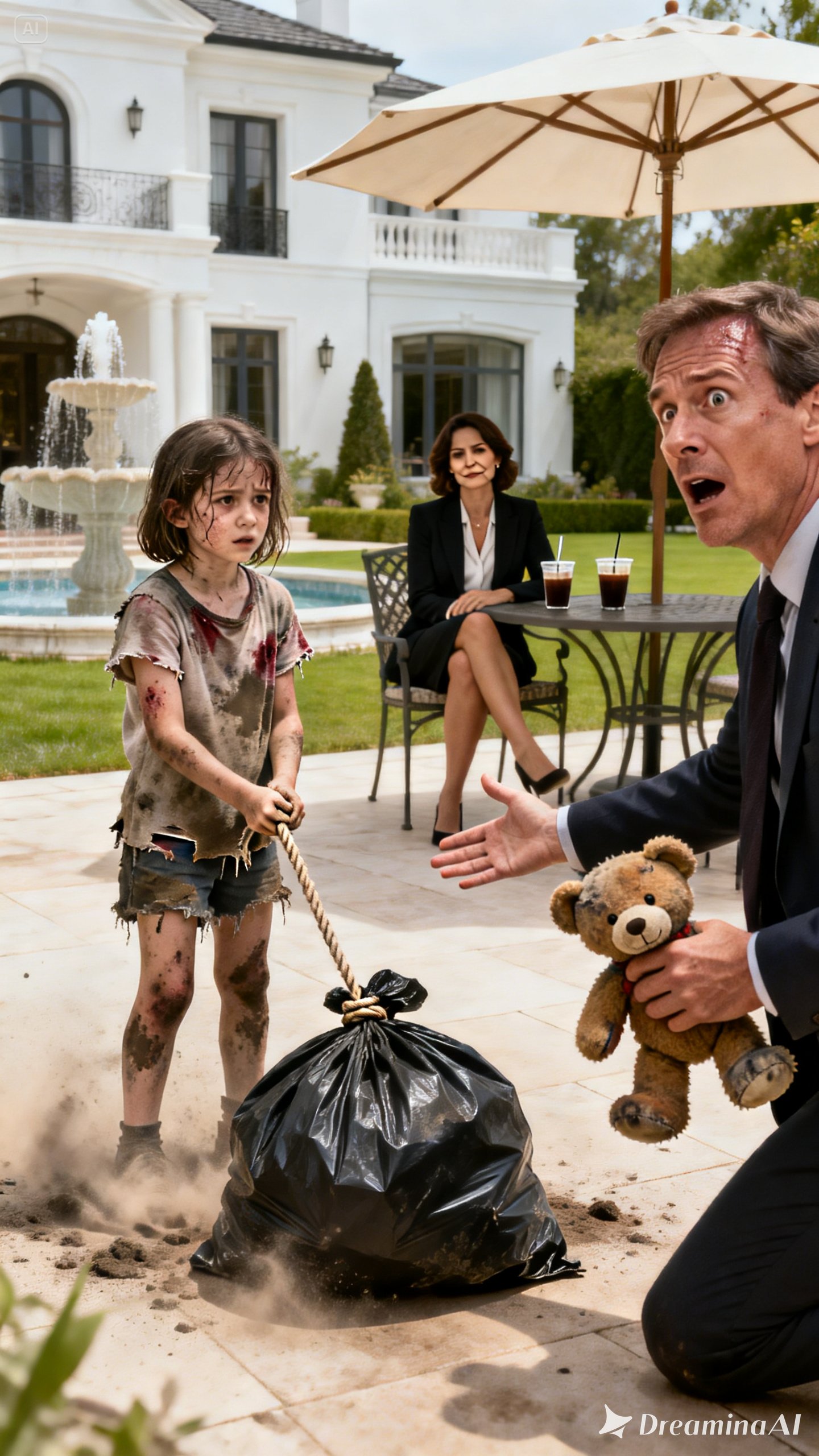 In the middle of the pristine garden, under the harsh sun, Maya struggled with a black trash bag nearly as big as she was. She wore an oversized shirt, dirt smeared across her arms, sweat and old tears streaking her face. Her hands were raw where the rope had rubbed.