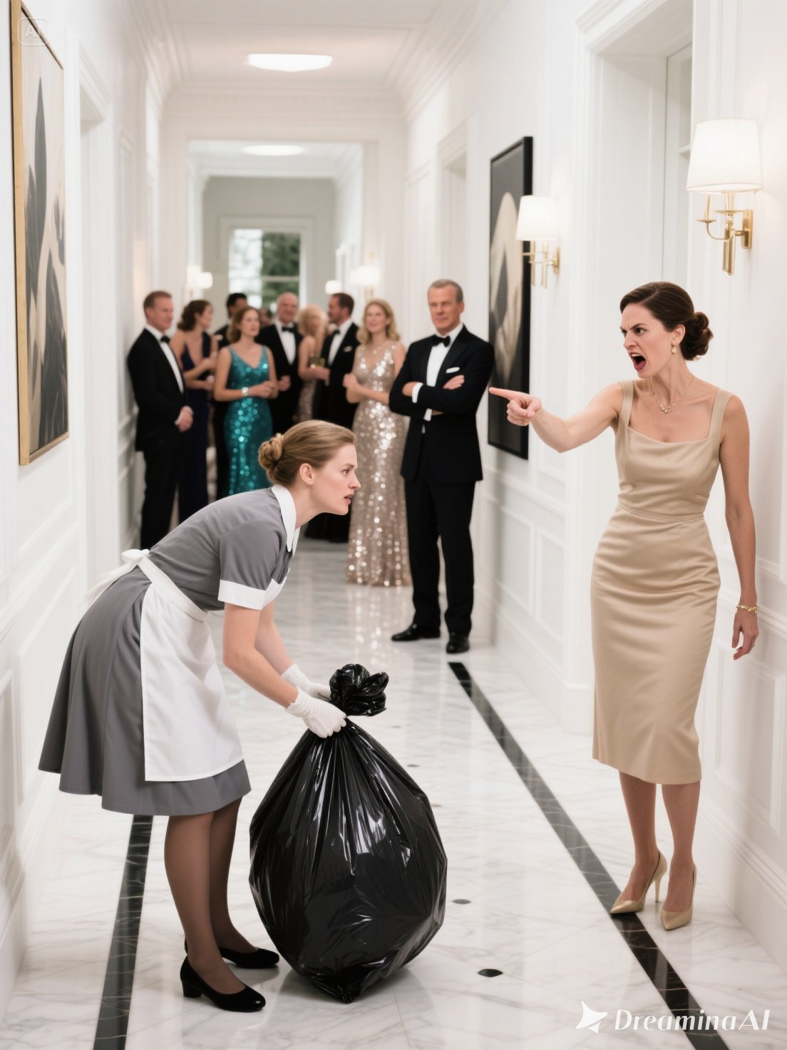 Rosa, the maid, stood frozen at the edge of the crowd, her small frame bowed under the weight of an overflowing trash bag. She had been moving silently, unnoticed—until Vanessa ensured no one could look away.