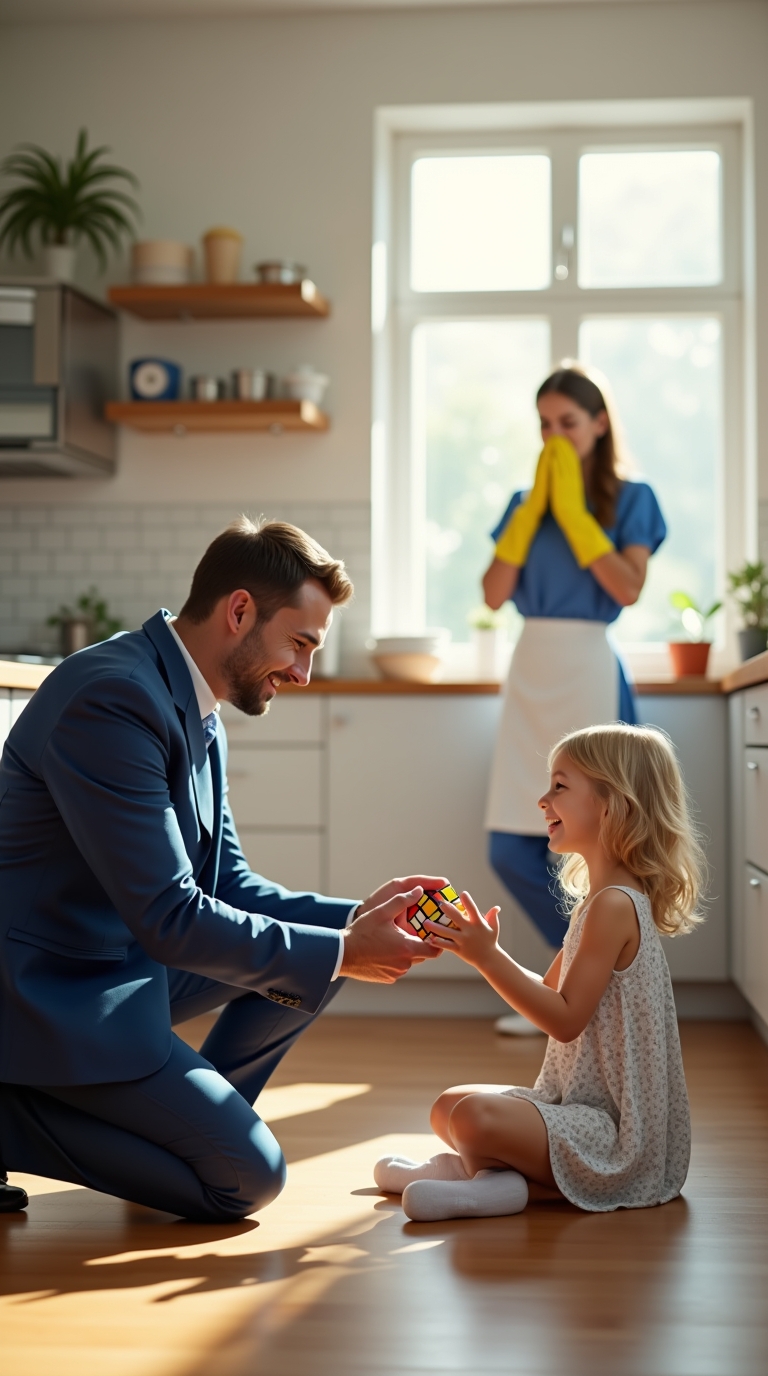 Entering through the service door, Claudia told Renata to sit in a kitchen corner where she could see her. She handed her colored pencils and paper, and the girl began drawing while Claudia started her cleaning rounds — washing dishes, sweeping, mopping, dusting, and straightening cushions.