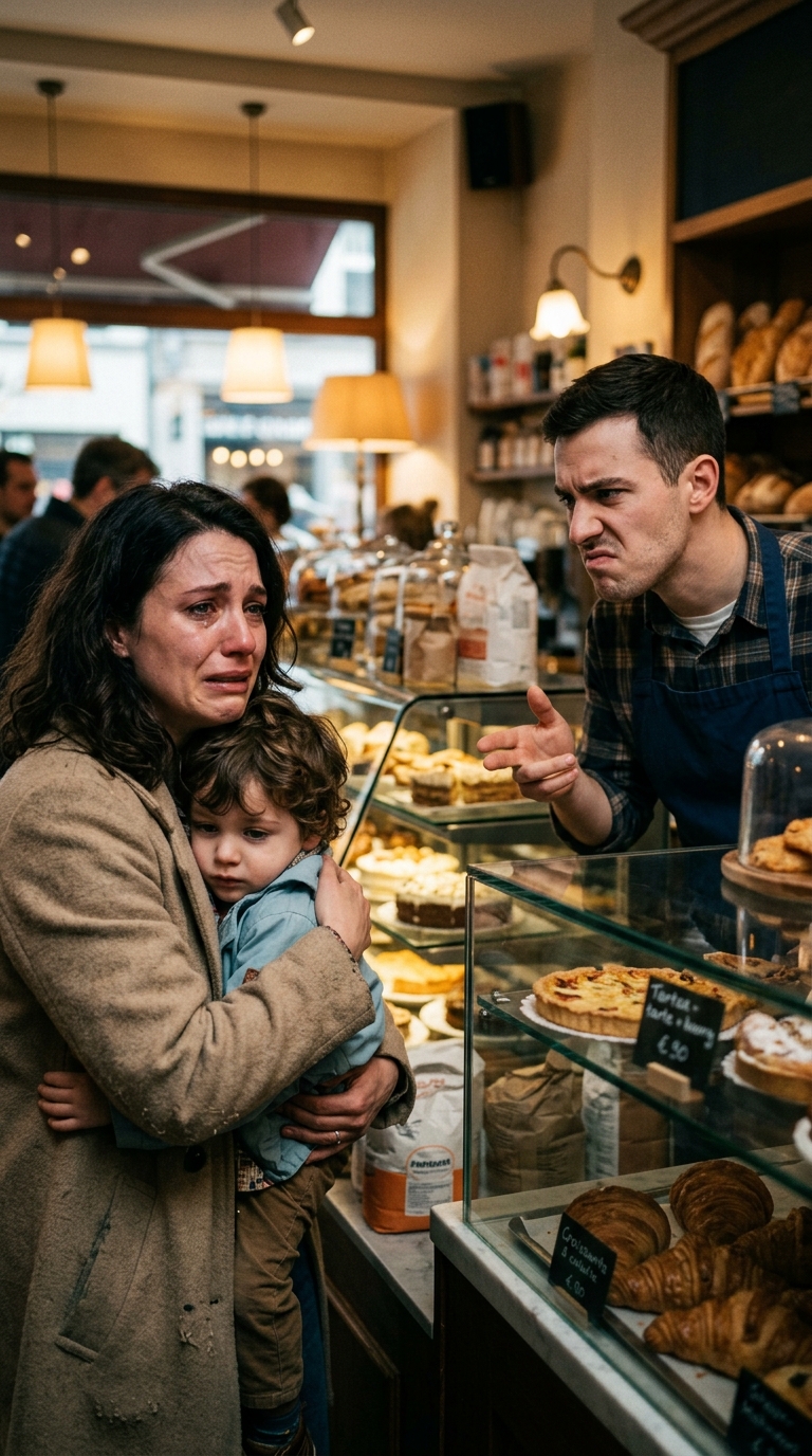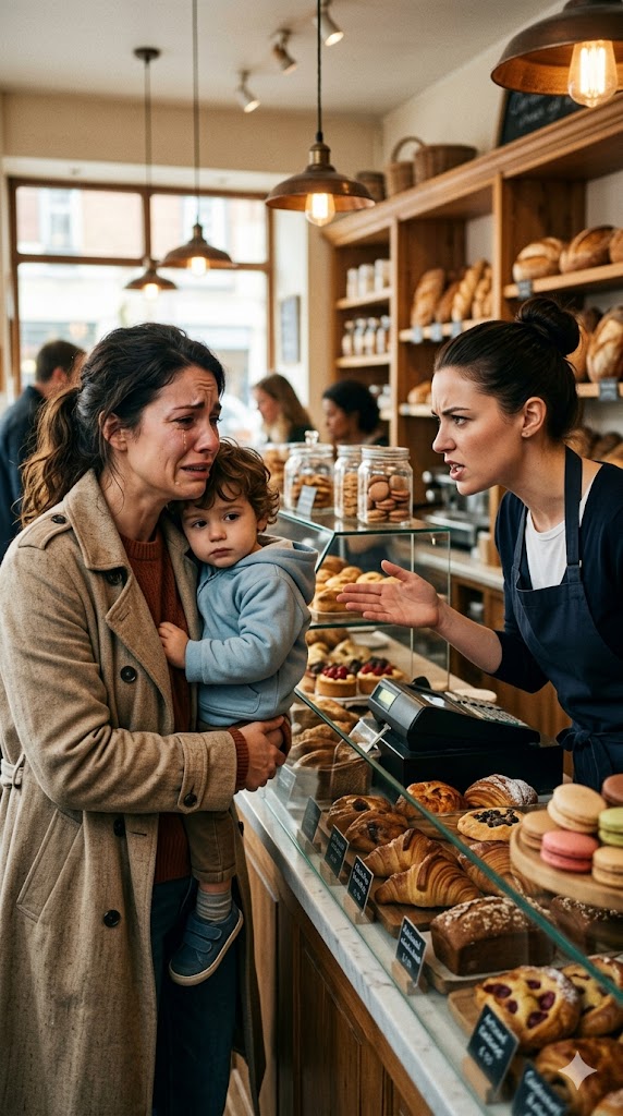 The bakery went quiet. Conversations at nearby tables faded. A few patrons turned their heads, forks paused mid-air, watching the unfolding scene with a mix of curiosity and discomfort.