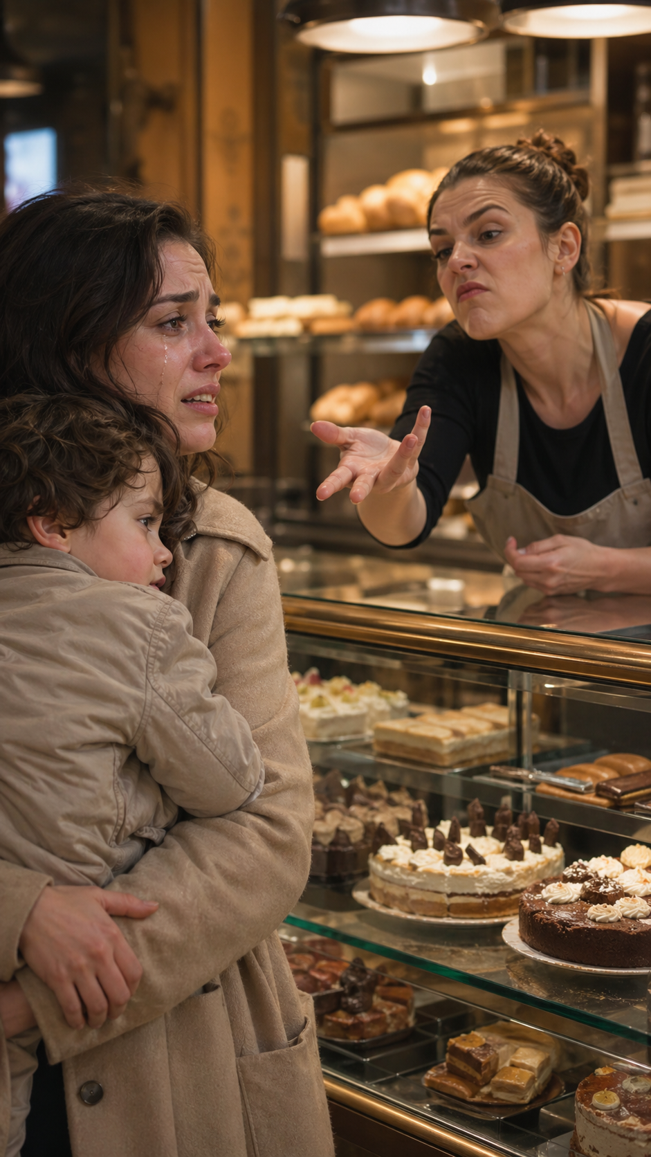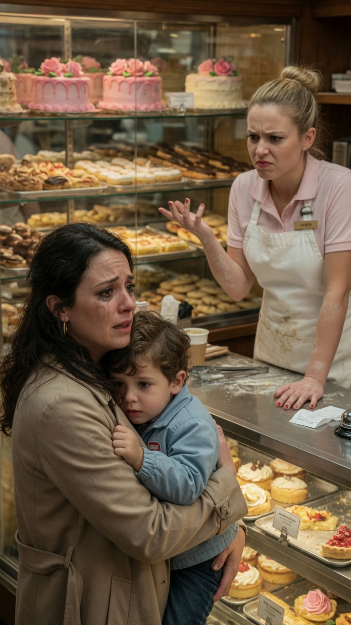 Elena covered her mouth with one hand, shaking her head slowly as if the sudden wave of kindness was too heavy, too overwhelming to accept after so much rejection. Daniel looked from the glittering display of cakes to the tall stranger, his small face still clouded with confusion and lingering fear.