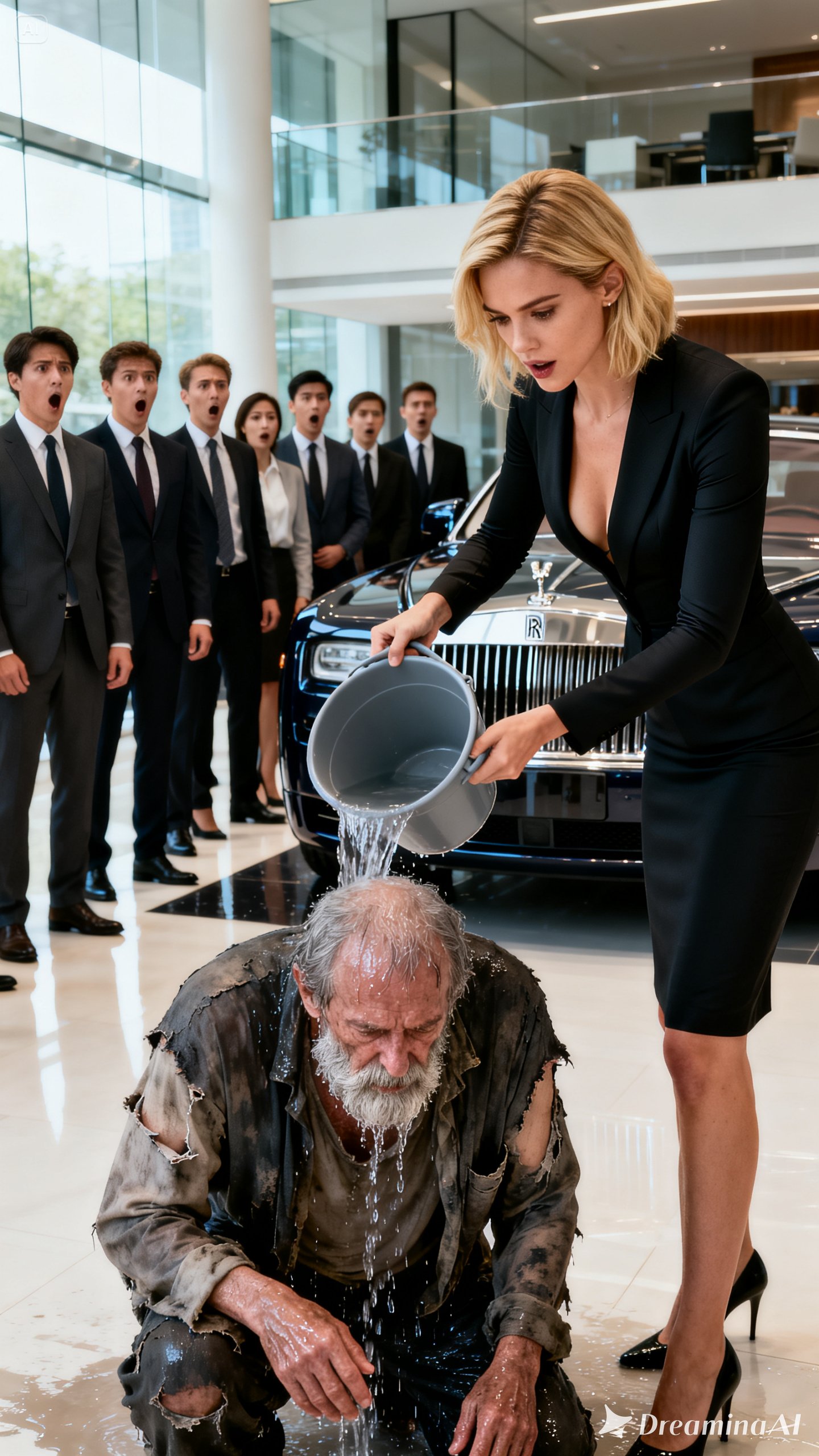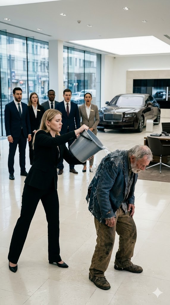 The old man tried to speak, but she cut him off. Without hesitation, she picked up a bucket of water, walked toward him, and poured it over his head in front of everyone.