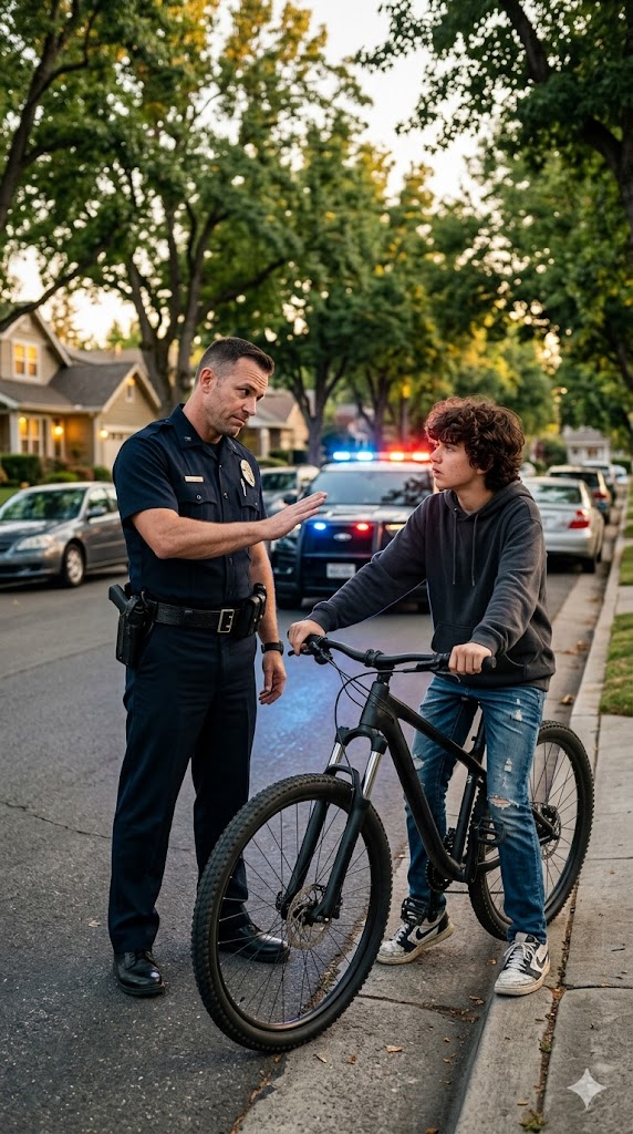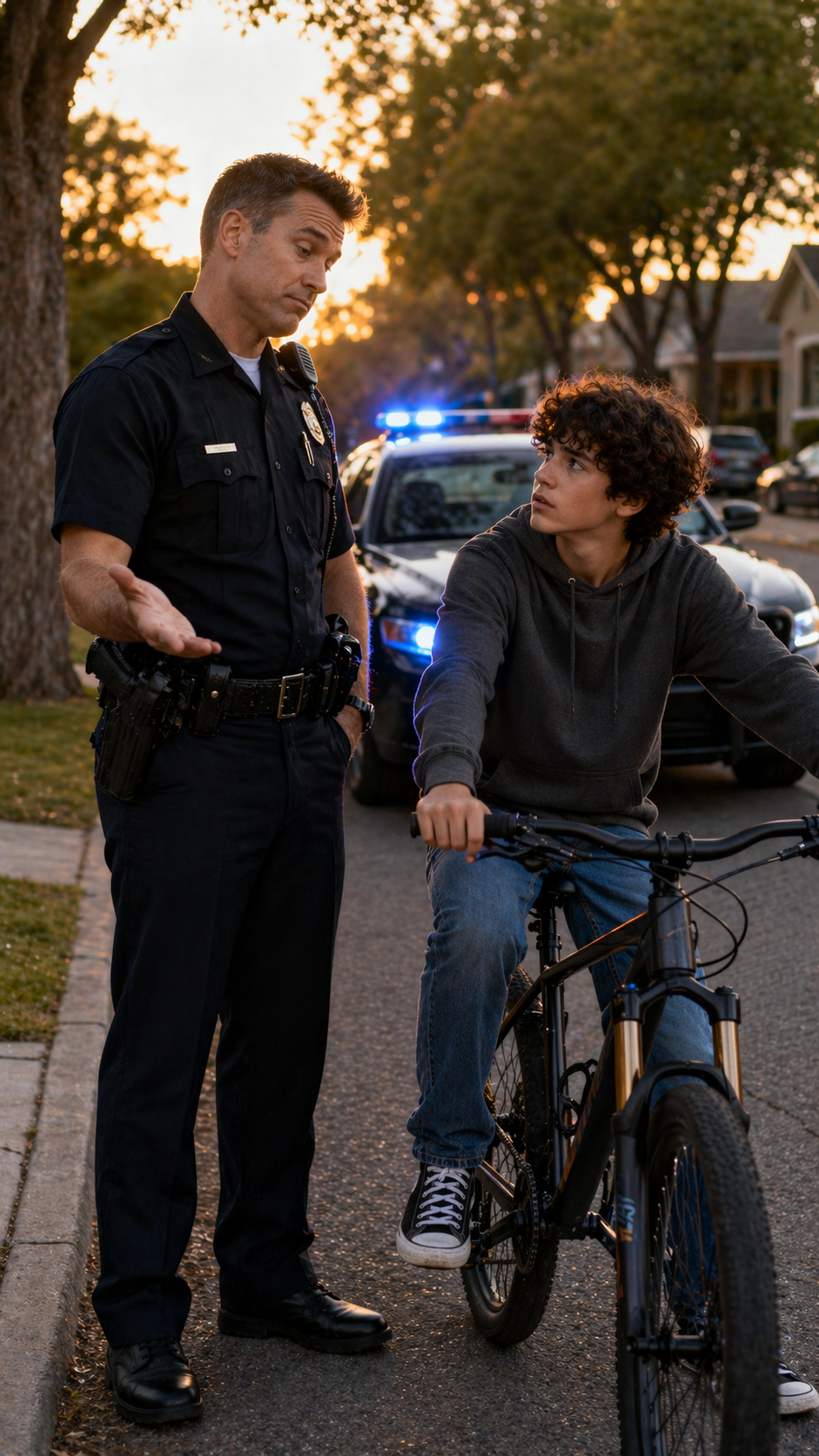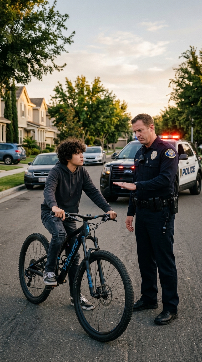 The officer didn’t answer right away. His gaze fixed on the bicycle. He moved closer, circling Marcus slowly, inspecting the bike as if it didn’t belong in that setting.