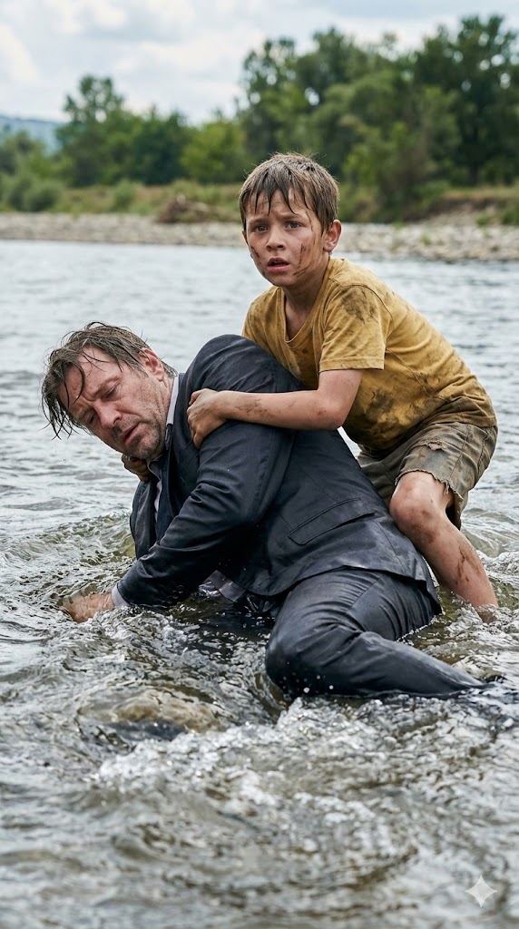He dropped into the river like a stone—fifteen meters down—hitting the water so hard it looked solid. His suit became a weight. His shoes became anchors. He surfaced once, eyes wild, choking… then slipped under again.