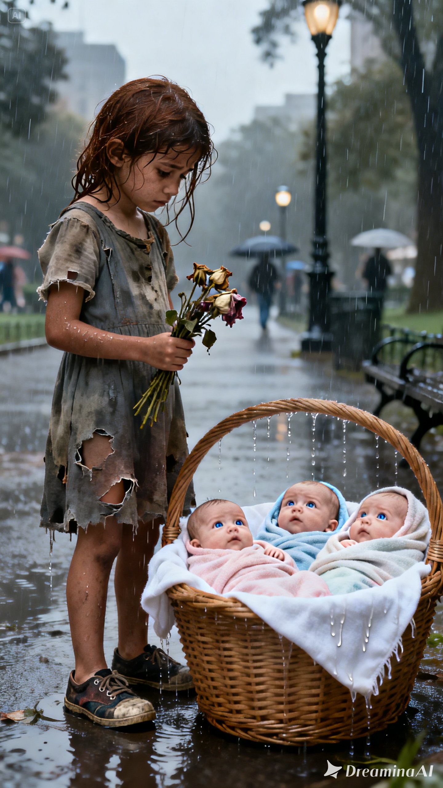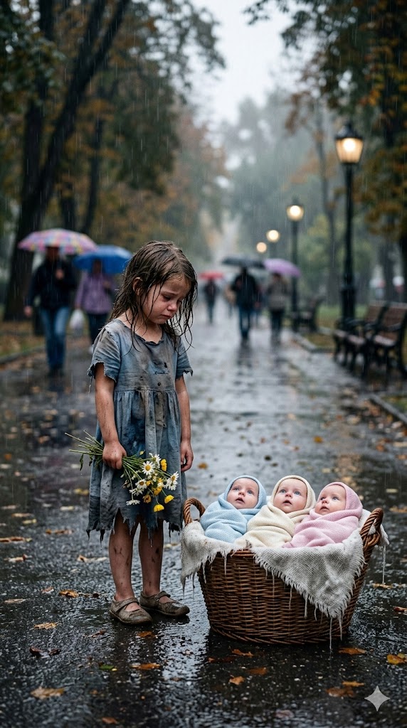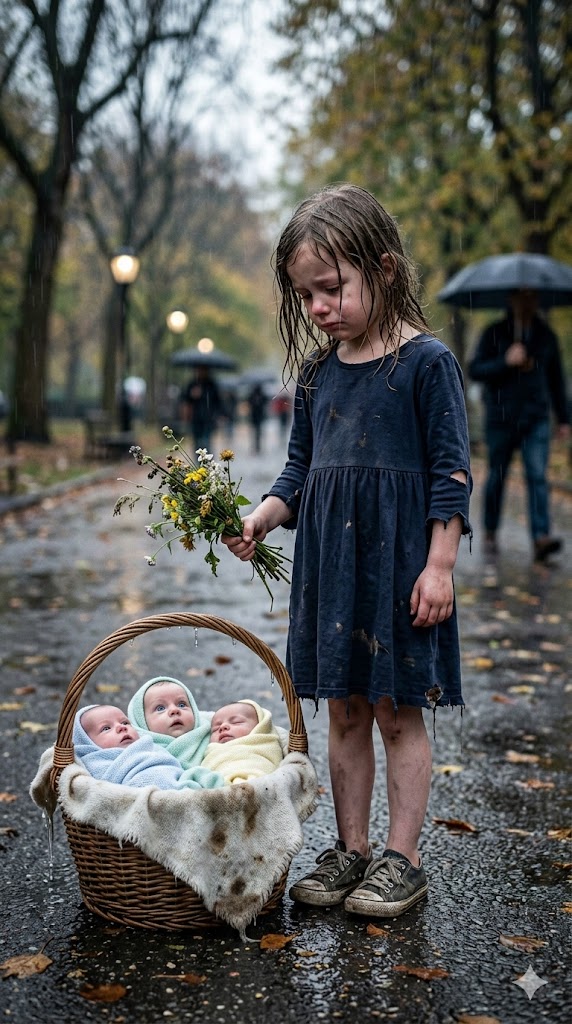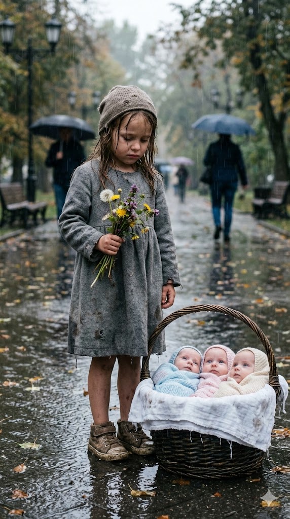 Only seven years old, she stood near the park entrance, clutching a small bundle of wilted flowers she had picked from the cemetery earlier that morning. Her dress was far too light for the cold. The bottoms of her shoes had split open so badly that water seeped in with every step.
