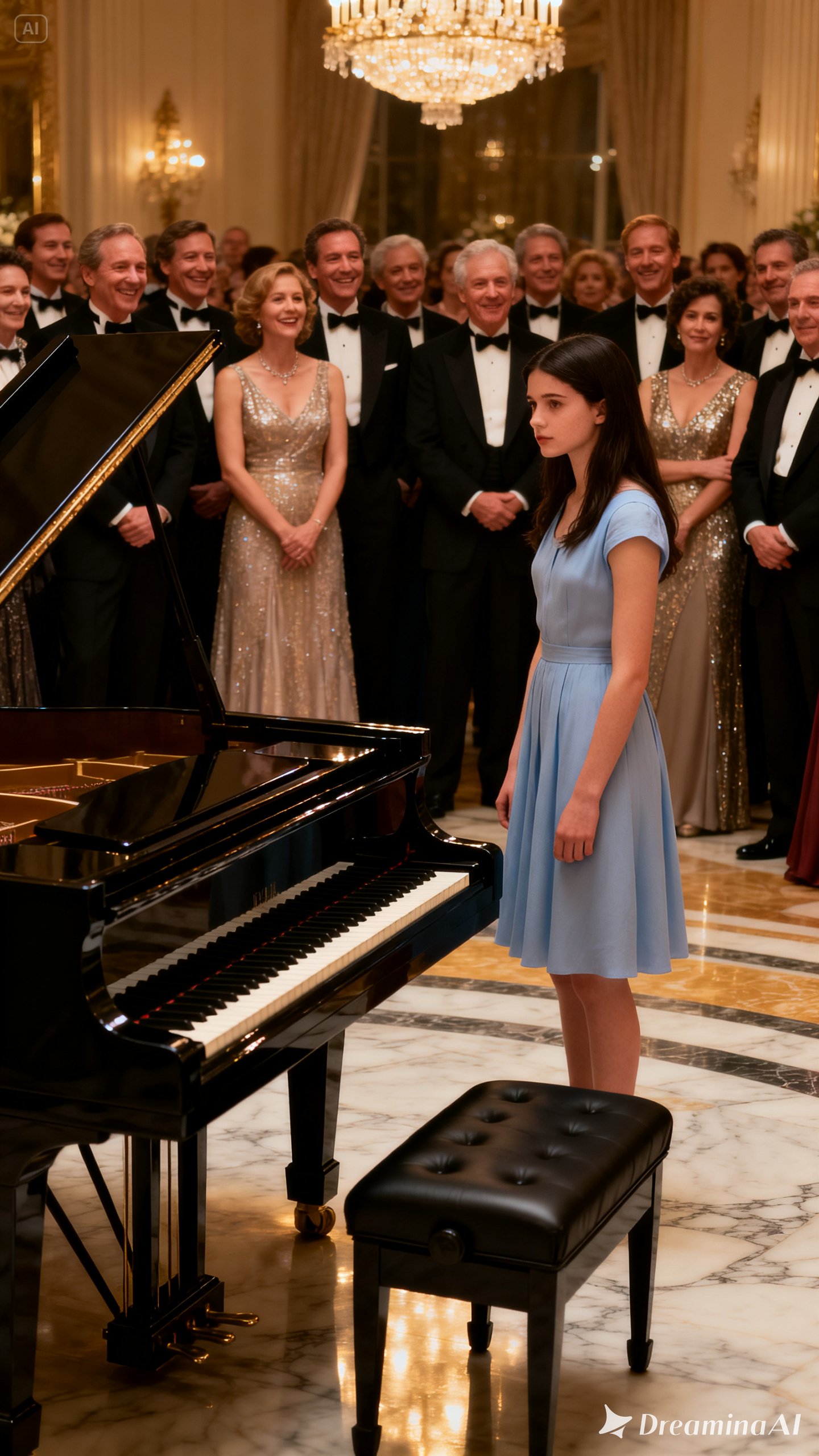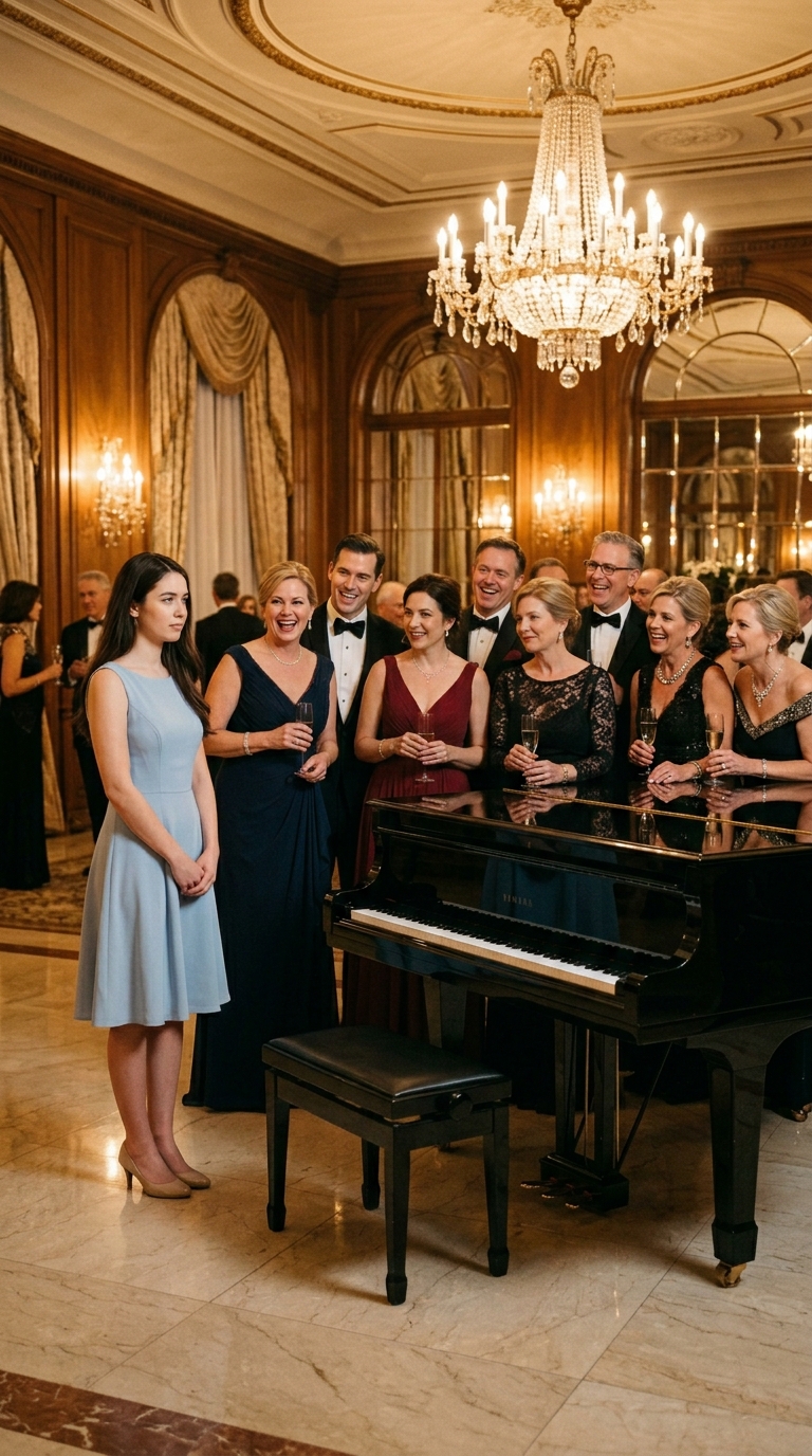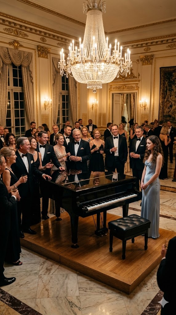 Then all eyes fell on her. A young woman in a faded light-blue dress stood beside the black grand piano. Her dress was plain. Her hands remained still. Her gaze stayed lowered, as though she already knew she didn’t belong in their world.