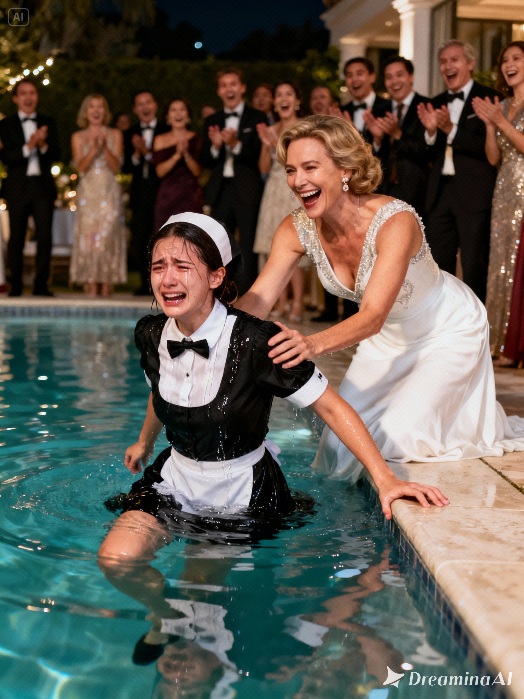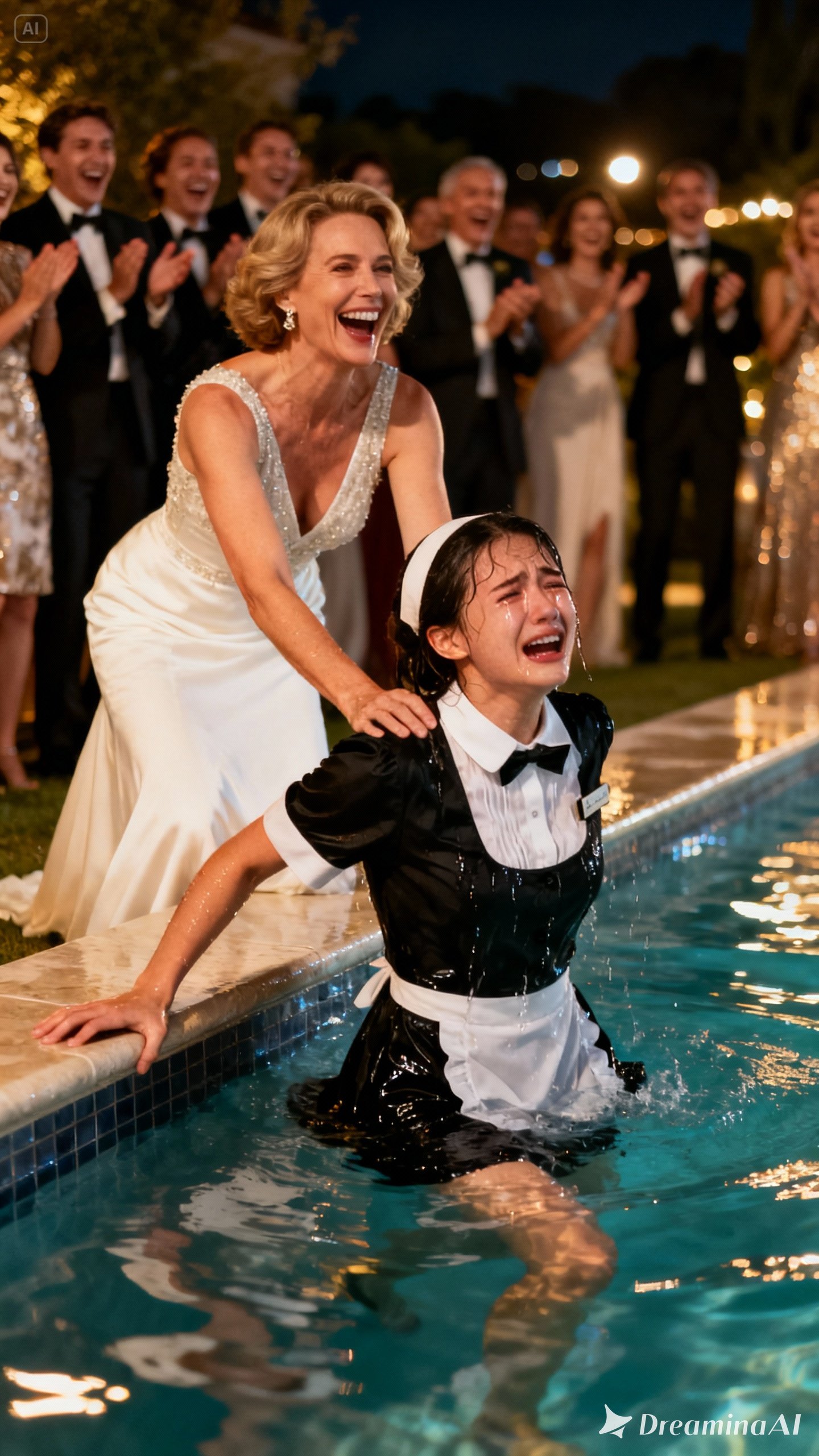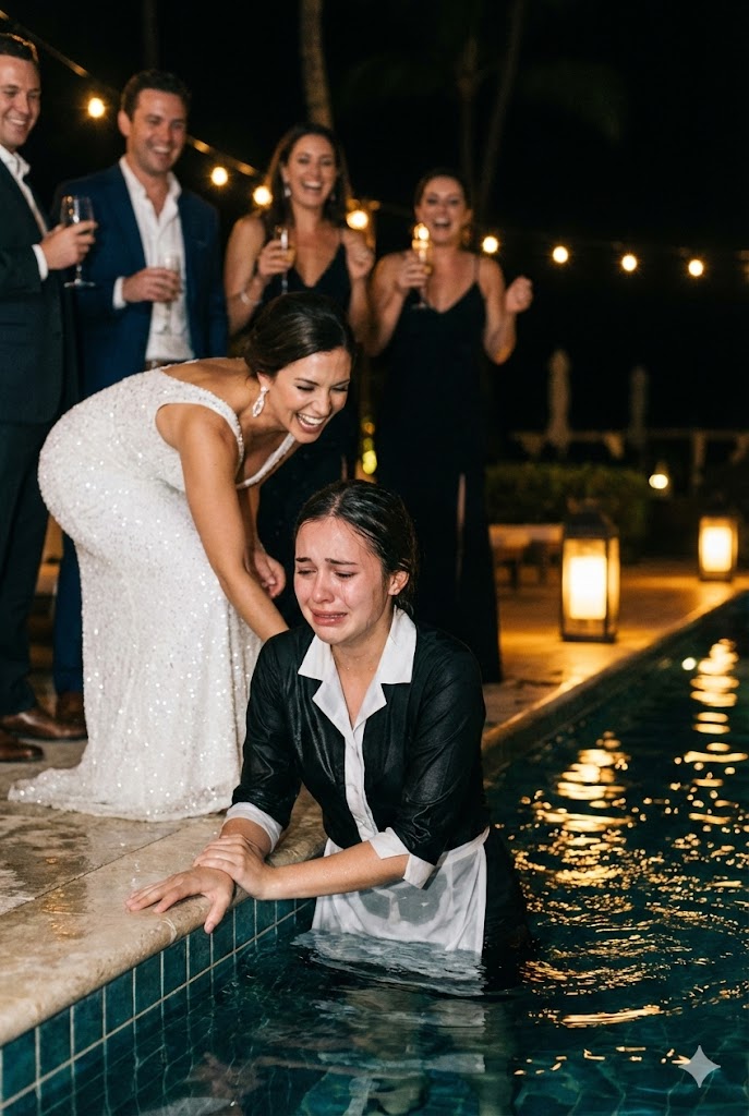 Sophie surfaced, gasping, her hair plastered to her face, her uniform clinging to her like a second layer of shame. She tried to climb out, hands trembling on the slick tiles, but before she could, someone tilted a champagne bottle over her head. Fizz streamed into her hair and eyes. The laughter exploded again.