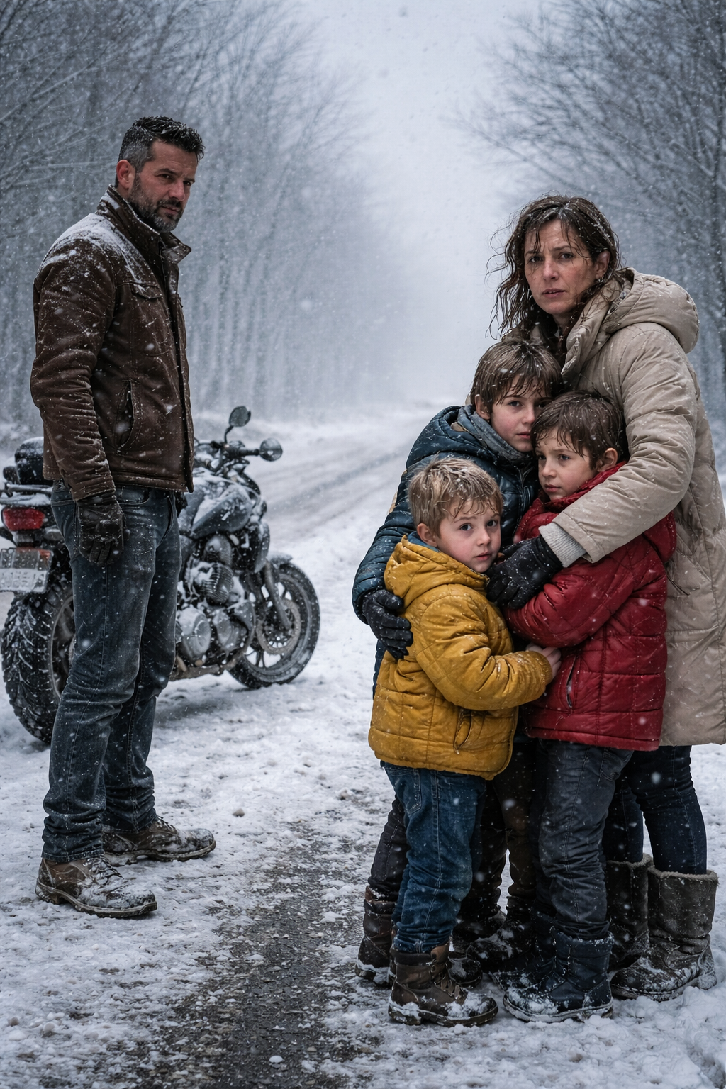 What mattered was the look in her eyes as she studied him—the worn biker vest under flannel, the heavy boots, the beard darkened with melting snow, the motorcycle idling behind him like a rough machine shaped by a hard life. She measured him in silence, deciding whether he was a risk she couldn’t afford or the only help left standing between her children and the storm.