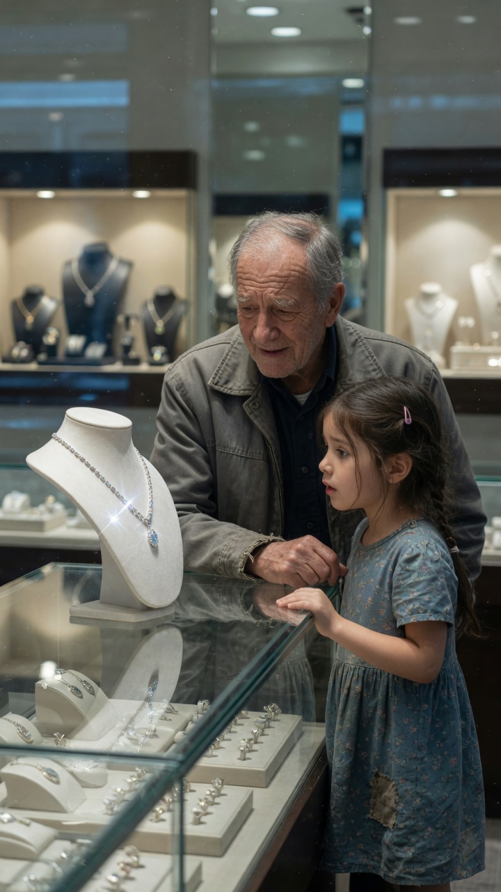 “Grandpa… if one day we have enough, can I have the little heart one?” she asked softly, pressing her fingers against the glass.