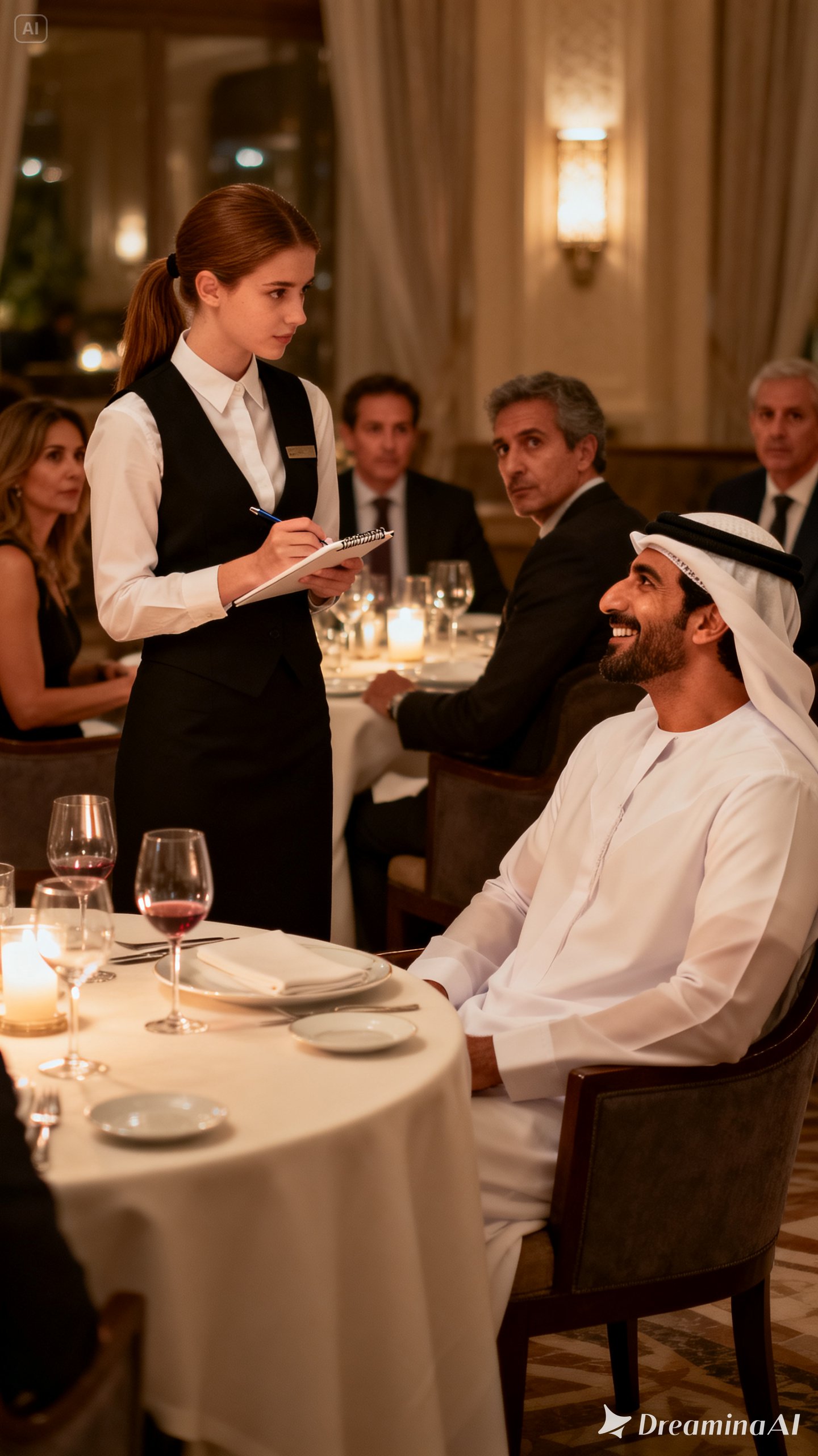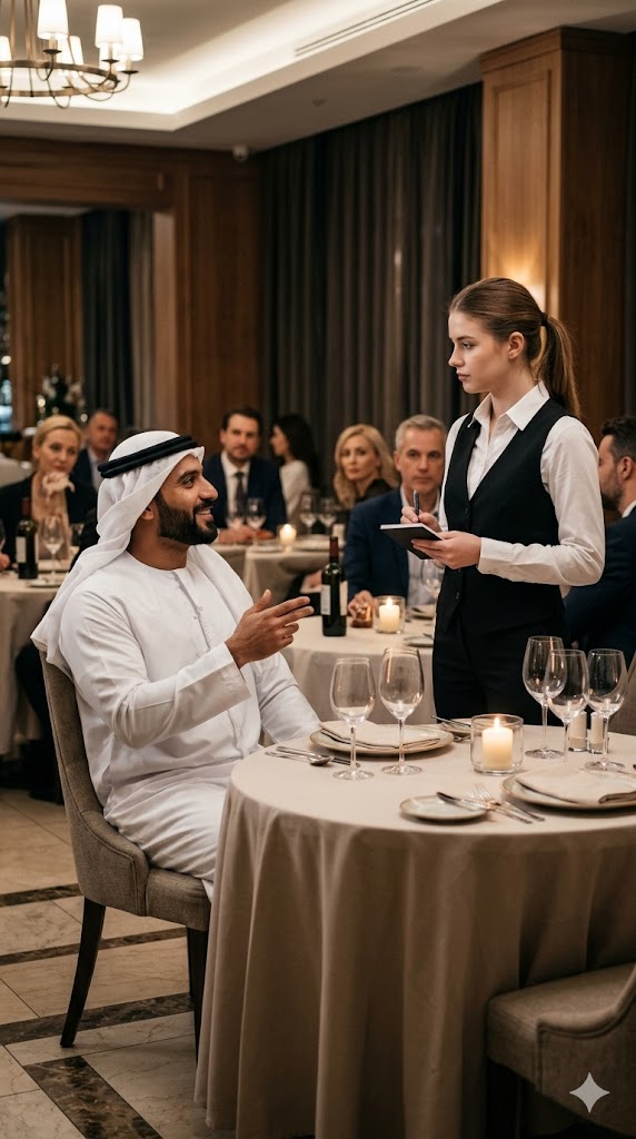 In one of the most luxurious restaurants in the city, the usual atmosphere of such places filled the space: soft live music, the clinking of glasses, quiet conversations. Snow-white tablecloths, expensive tableware, soft lighting — everything looked flawless. At one of the central tables sat the sheikh with his business partners. They discussed deals, laughed, and occasionally spoke in low voices, but it was clear that he was the one in charge. At one point, a waitress approached their table. A young woman with neatly tied hair, a calm gaze, and a confident posture. She politely stopped beside them and, slightly leaning forward, asked: