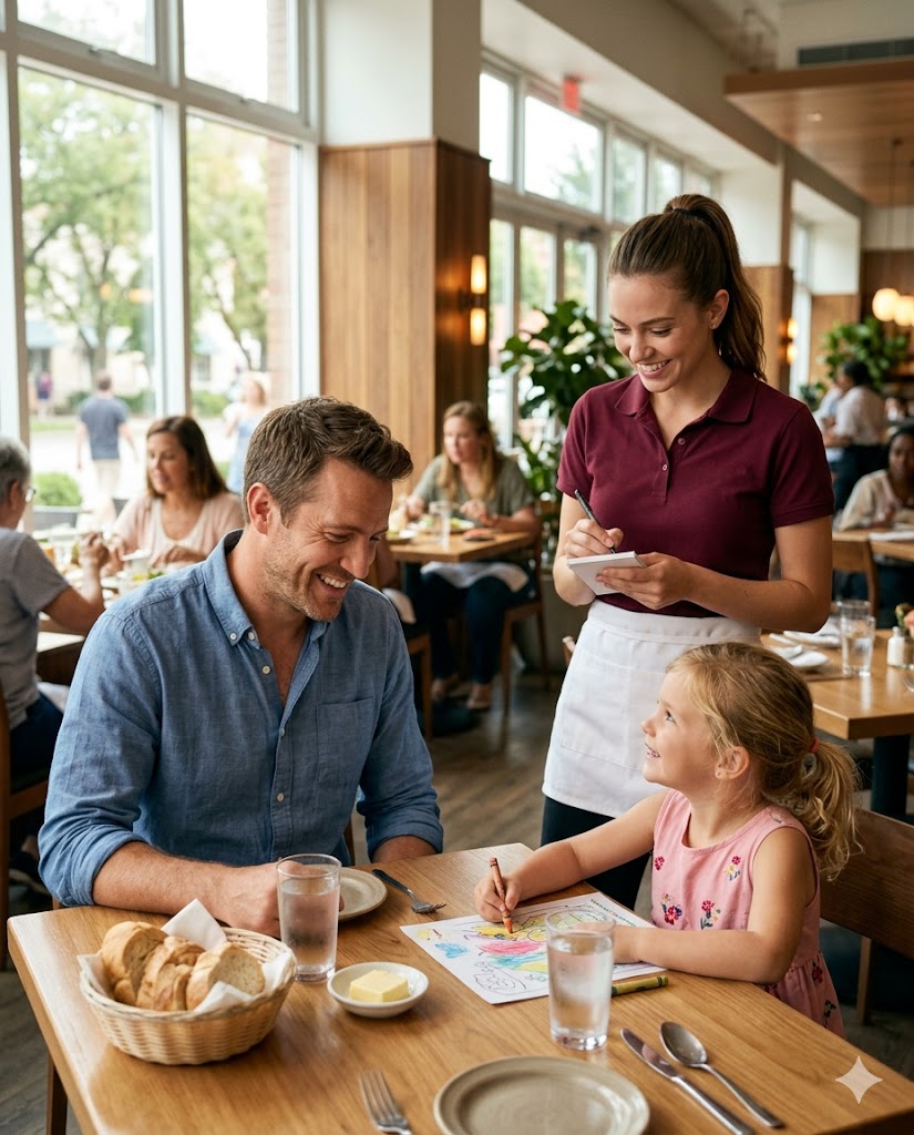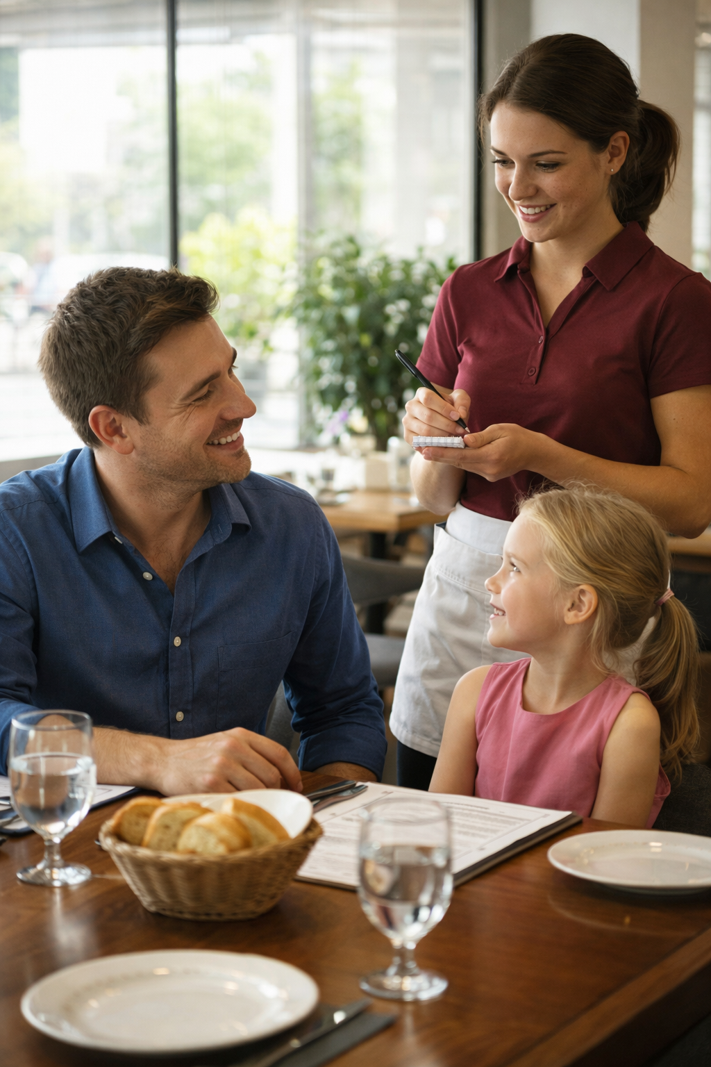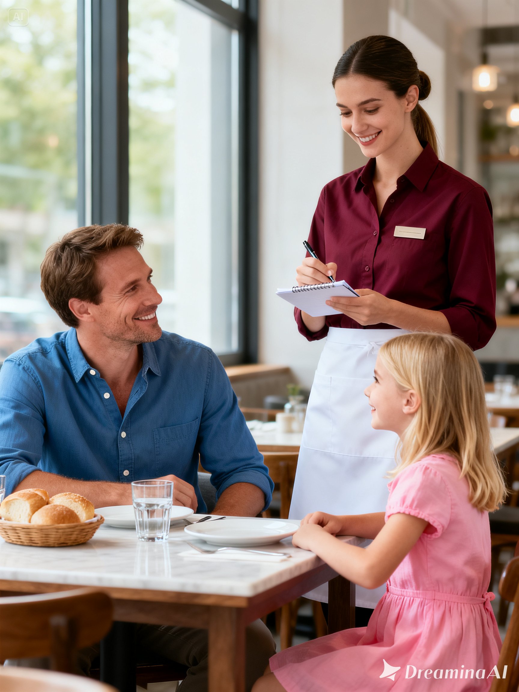 Sofia held a black notebook and a pen tucked behind her ear. Her uniform was simple—a maroon apron and white shirt—but her presence calmed the table without demanding attention. She didn’t look at Matthew with pity. First, she looked at Luna.