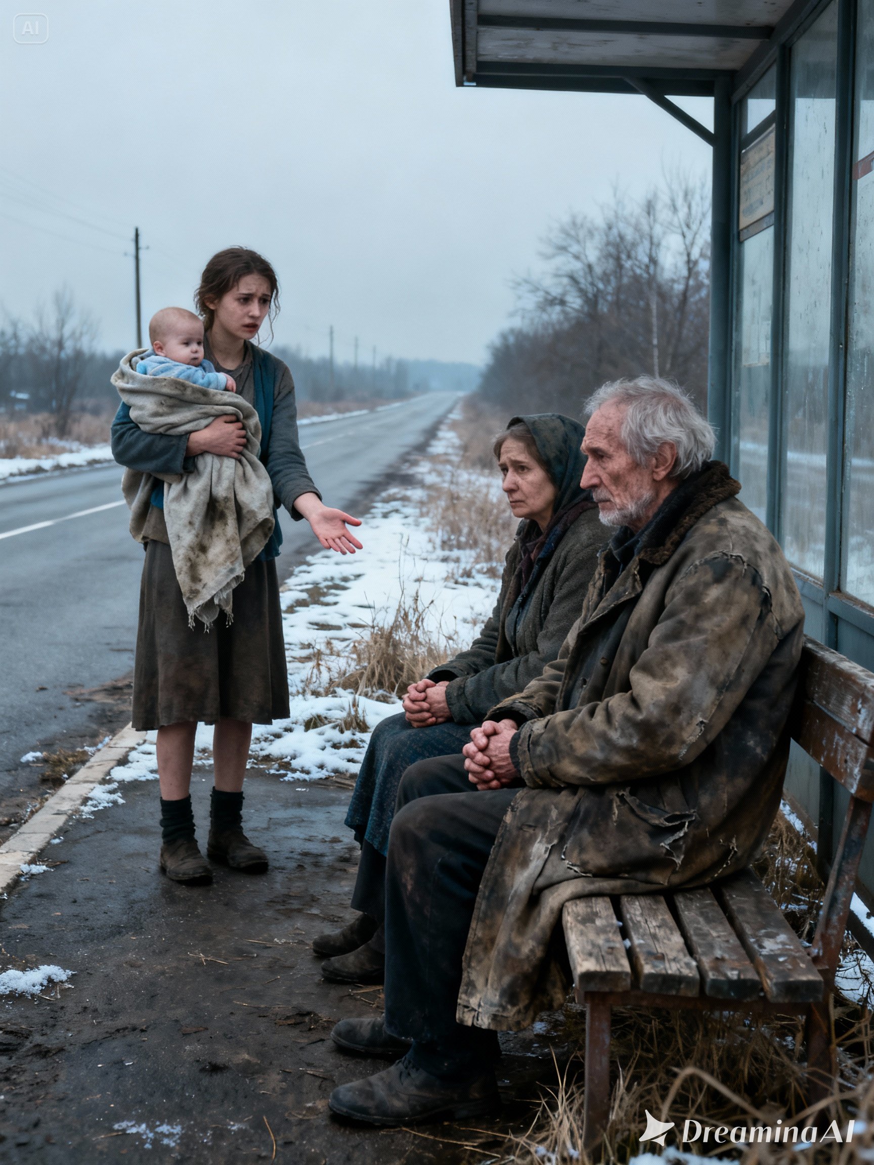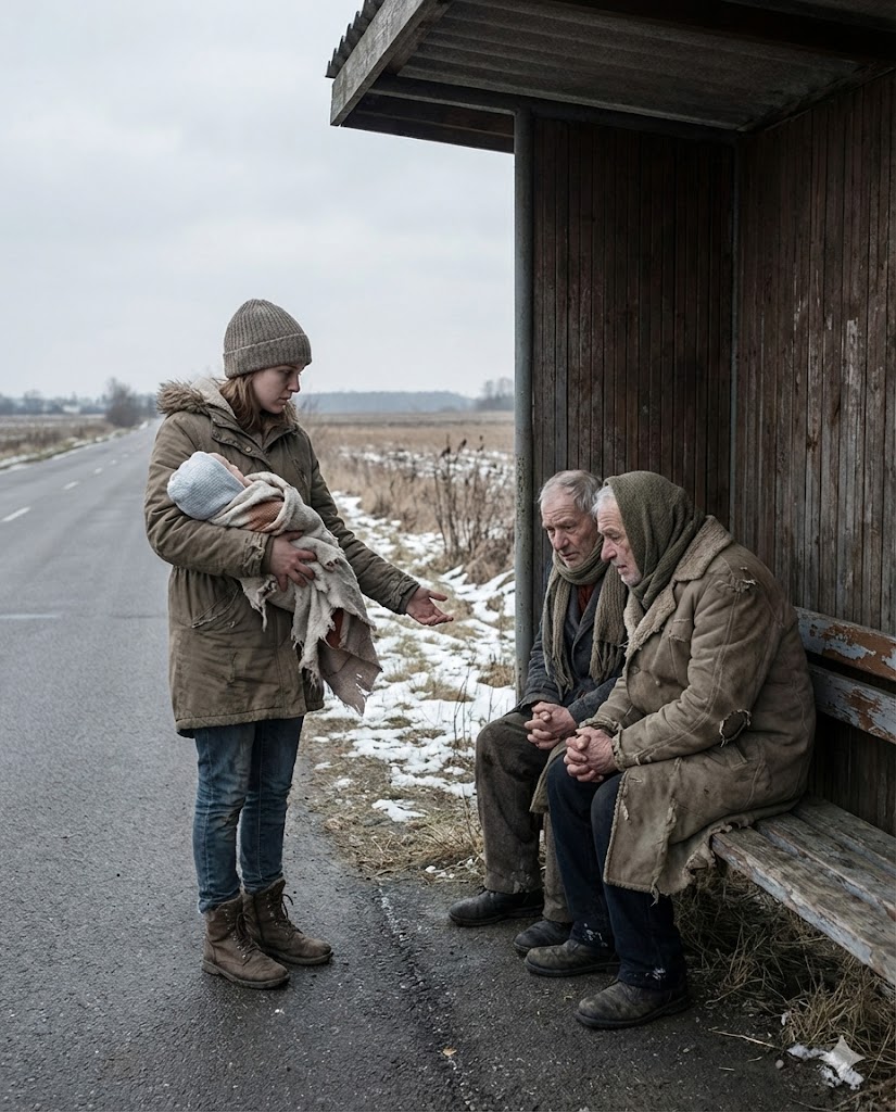 At the far end of the stone bench inside the bus shelter sat an elderly couple, huddled together under the dim light. Their hair was white—not soft and movie-like, but the thin, fragile kind that comes with age and wear. The woman’s face was buried in the man’s shoulder, her body shaking. The man had his arm around her, eyes shut tight, tears trailing down the deeply lined grooves of his face.