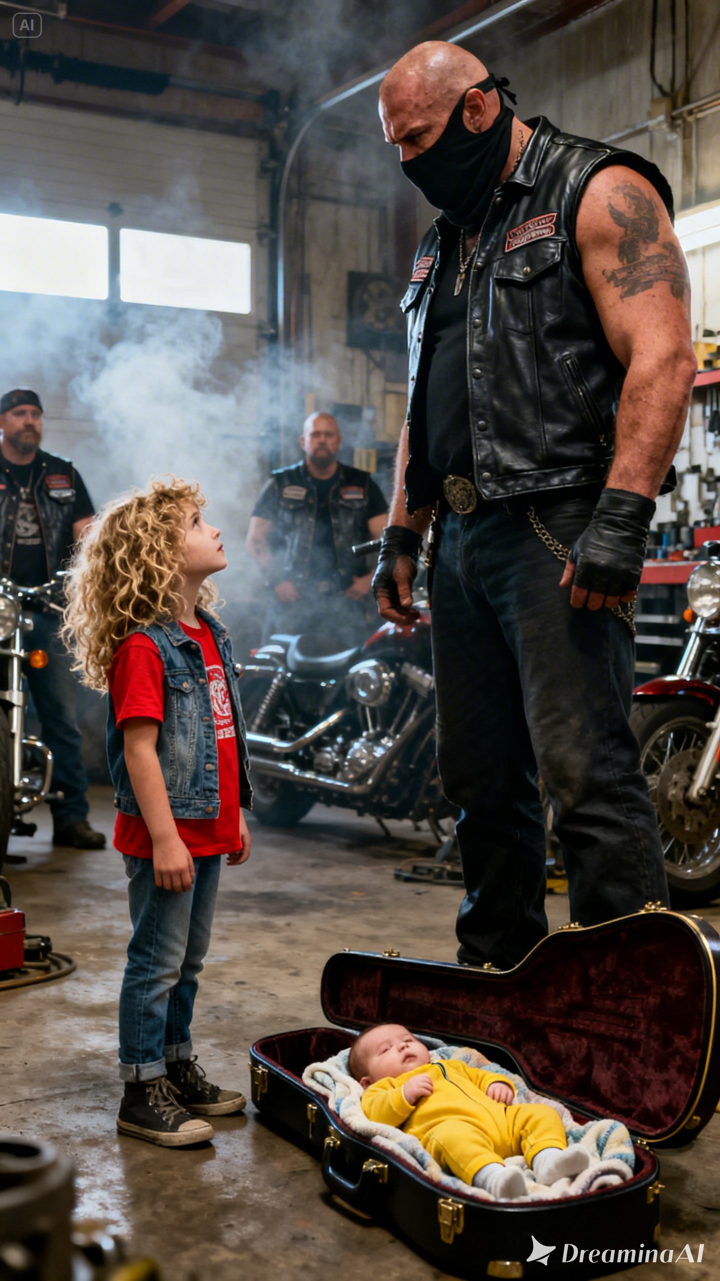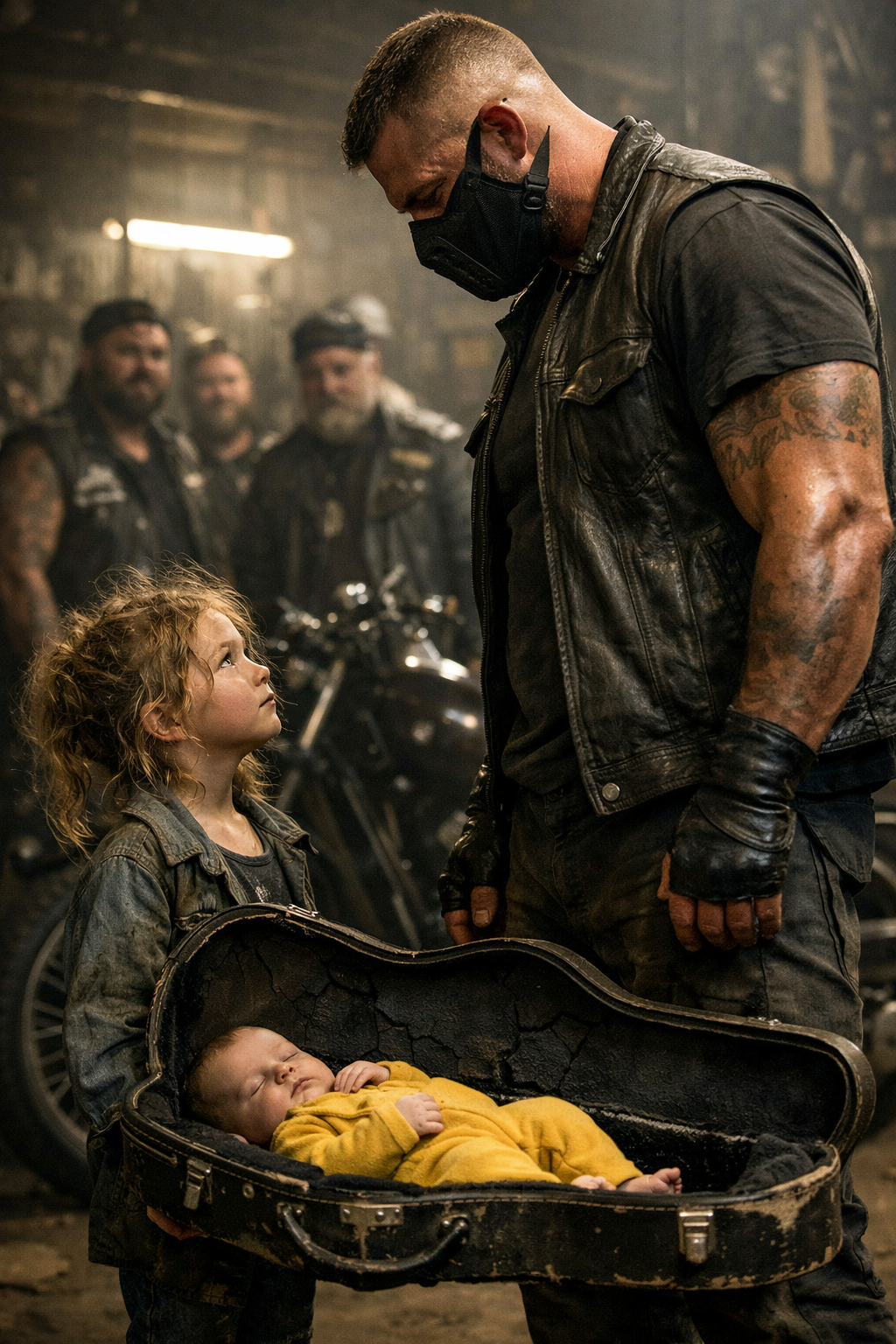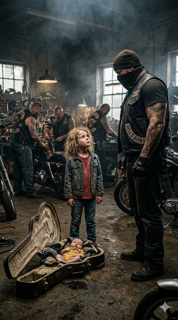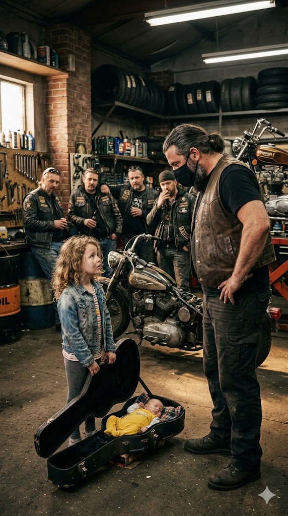 She couldn’t have been more than six. Small for her age, thin arms trembling as she hauled a scuffed dark-blue guitar case behind her. One edge of it was cracked open. Faded stickers peeled away from the surface. The hinges were rusted through. It looked impossibly heavy for someone her size, yet she kept pulling, jaw tight, eyes fixed ahead as if nothing would stop her until she reached the middle of the room.