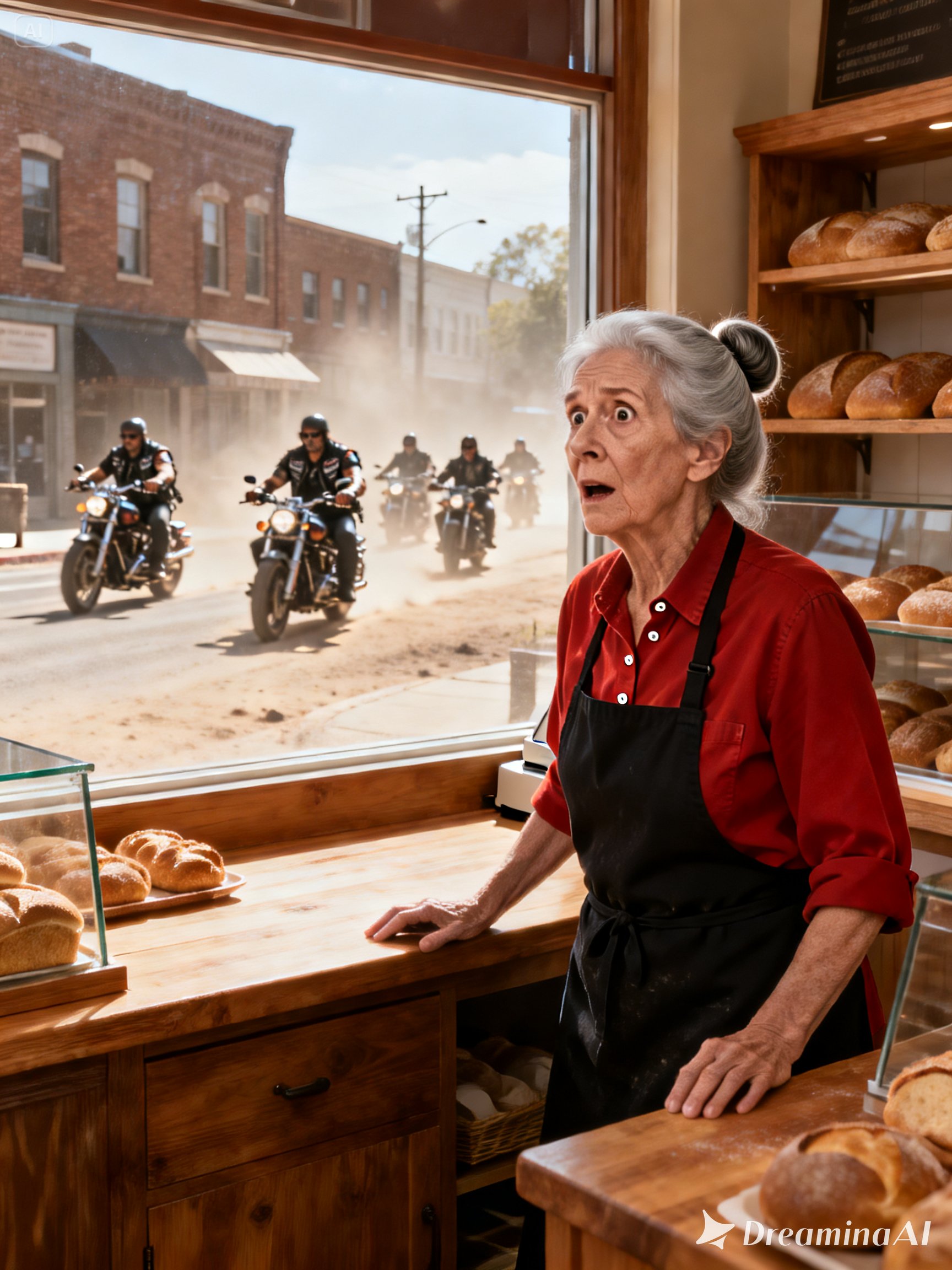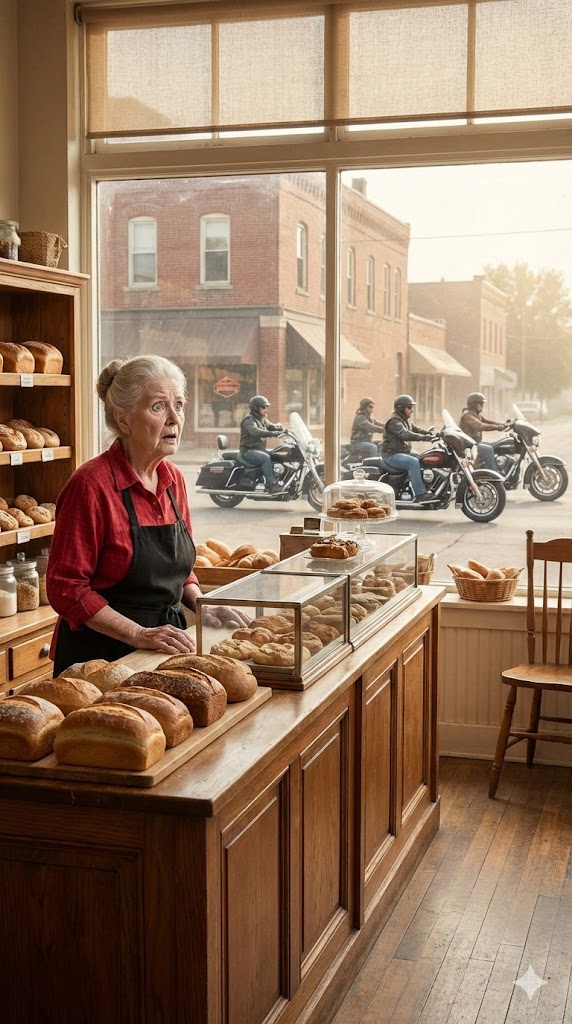 Laughter and applause filled the bakery, mingling with the scent of fresh bread as townspeople drew closer, curiosity replacing fear. Children climbed carefully onto parked motorcycles under attentive eyes.