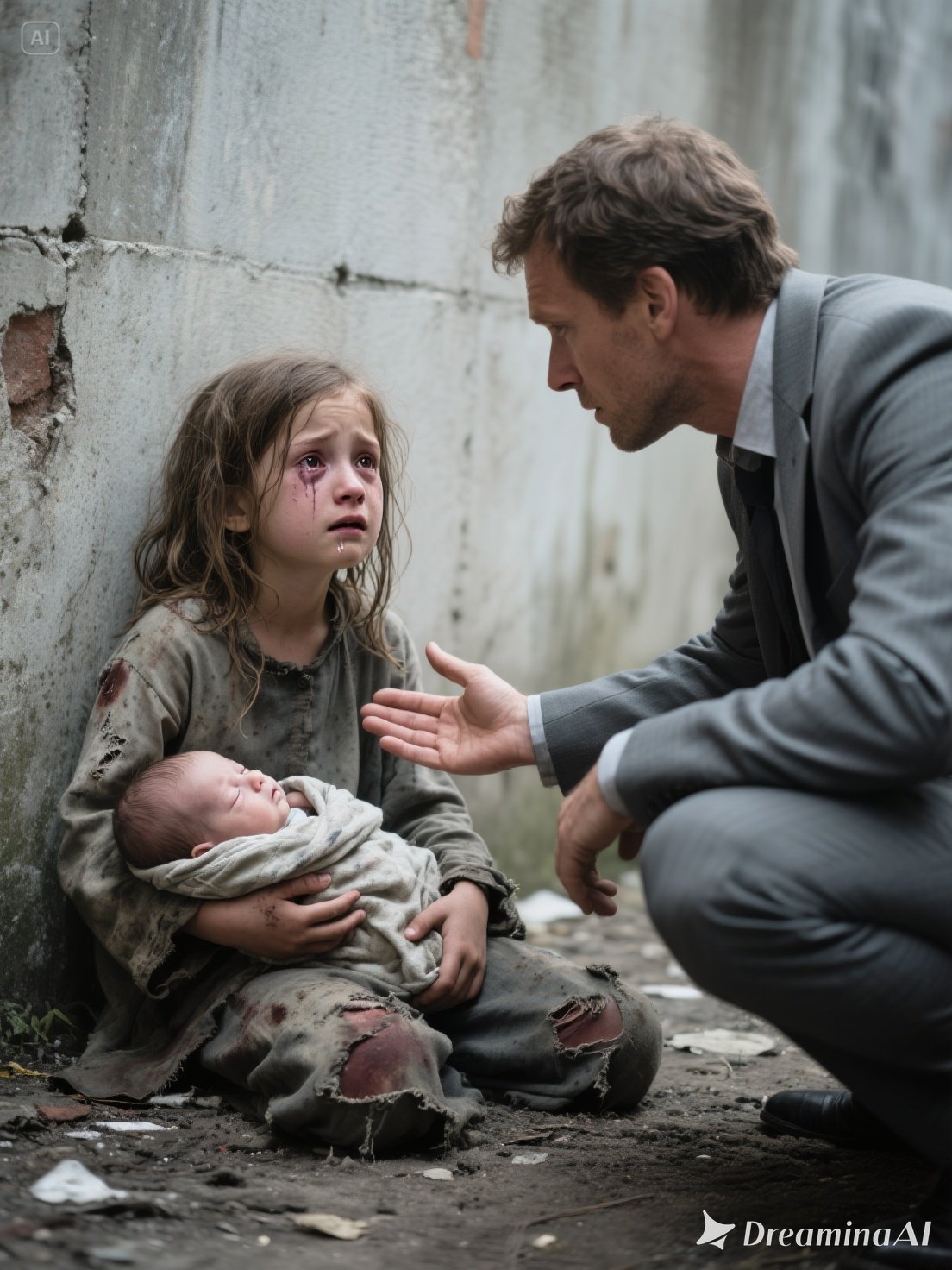 A girl, about eight, sitting on the filthy ground, brown hair stuck to her forehead, her face smeared with dirt and tears. Her clothes were patched scraps, and her bare feet were torn and hardened.